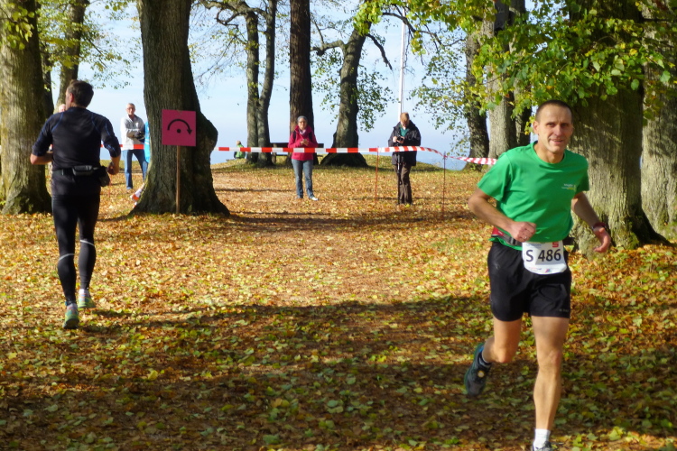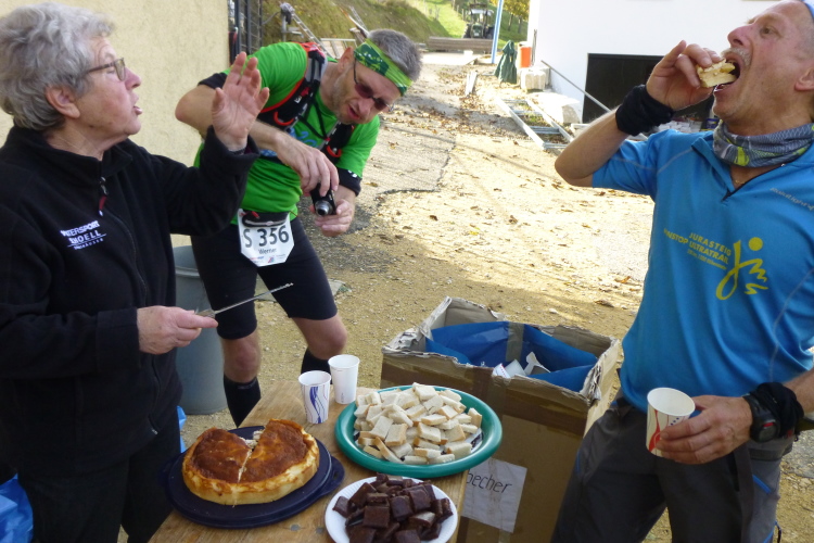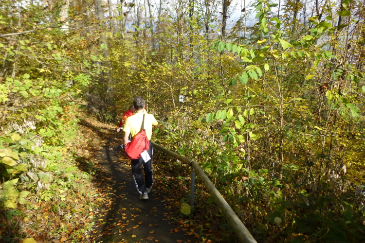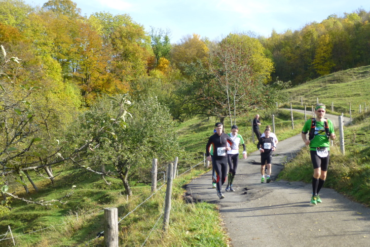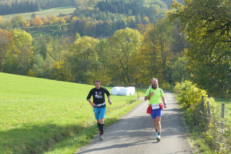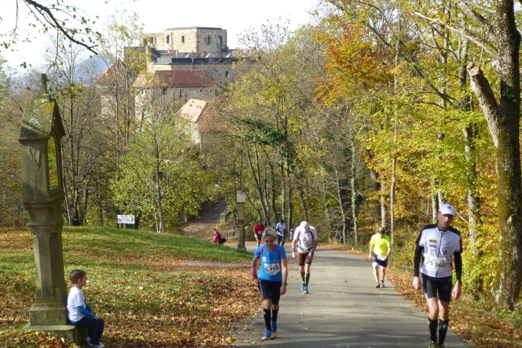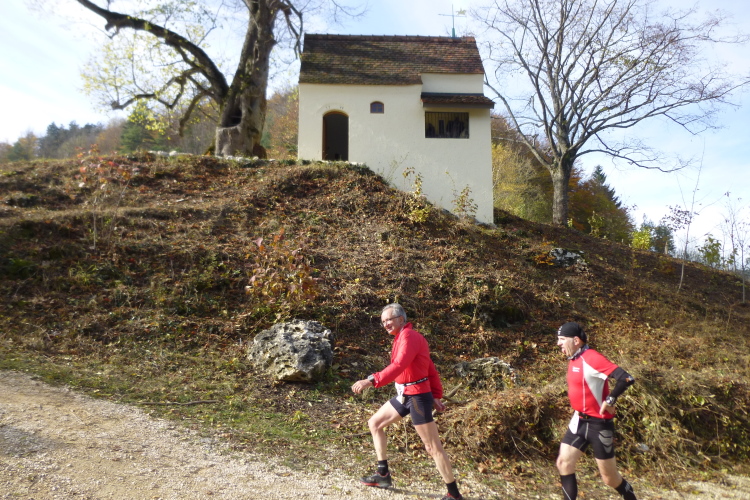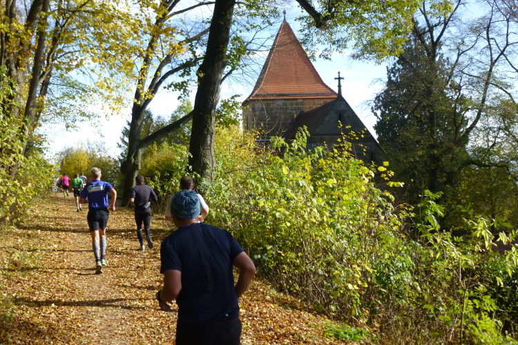 Die dort ankommenden Läufer haben allerdings ein sehr viel weltlicheres Ziel: Knapp die Hälfte der Läufer passiert nach einer Weiche bei km 25 auf 700 m üNN die Zielmatte und belagert glücklich und erschöpft sogleich die Zielverpflegung. Der Rest darf gleichfalls ein Päuslein bei Speis und Trank einlegen, muss sich jedoch dann von der herrschenden Jubel-Trubel-Stimmung verabschieden und sozusagen den Hinterausgang nehmen. Vorbei an der malerischen Kirche geht es auf der anderen Bergseite auf einem schmalen, durch Laub und Moos teils rutschigen Pfad im Zickzack jäh in die Tiefe. Was ein Glück, dass der Untergrund nicht auch noch feucht ist!
