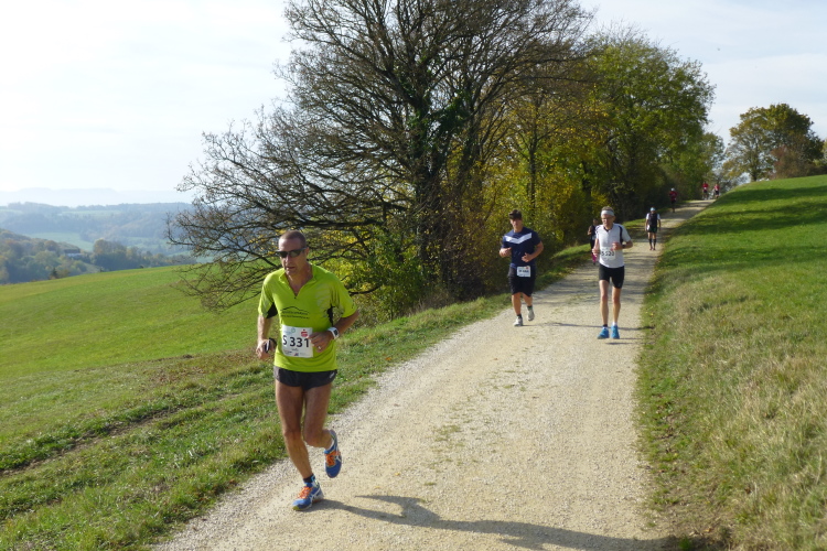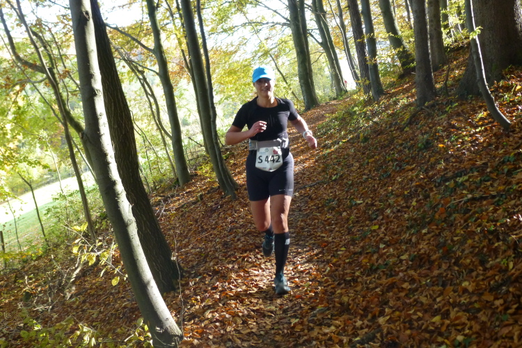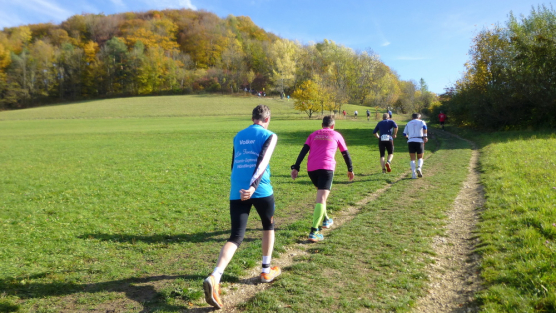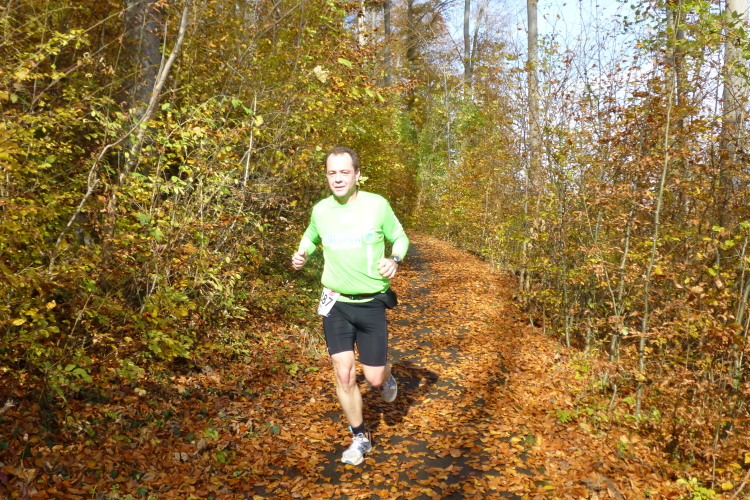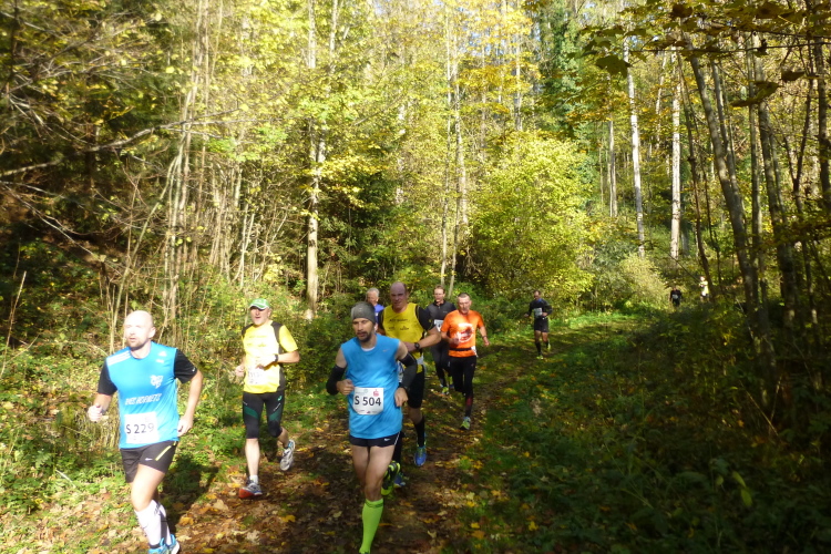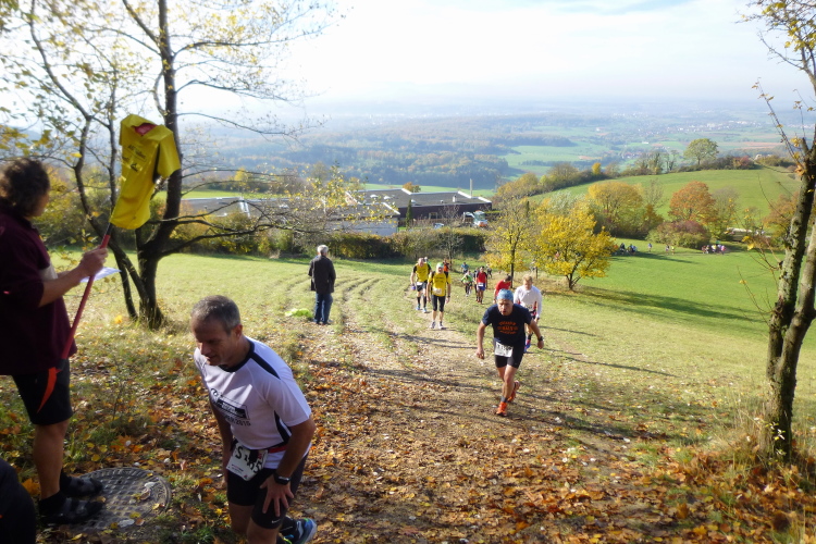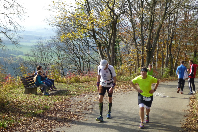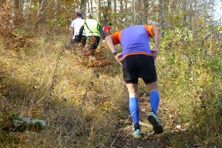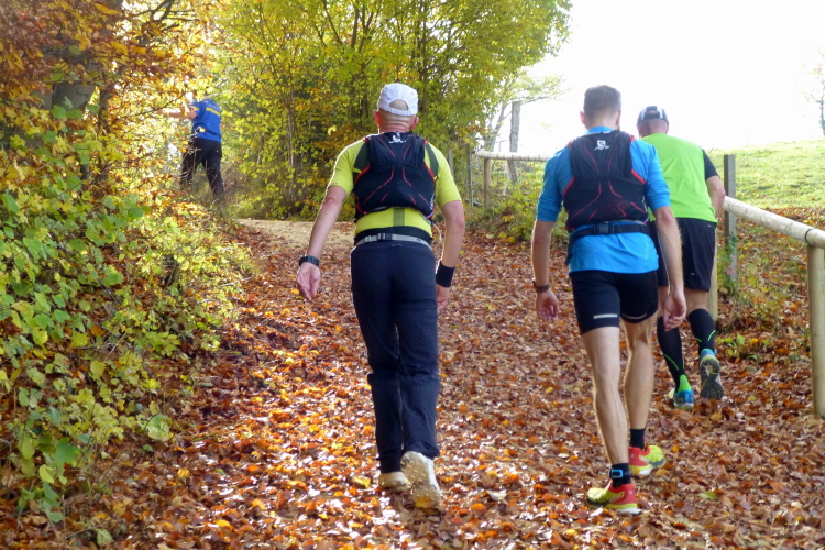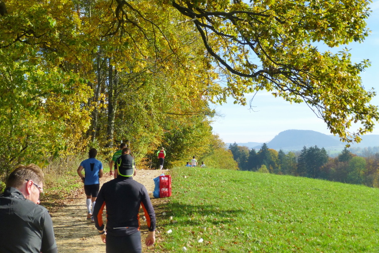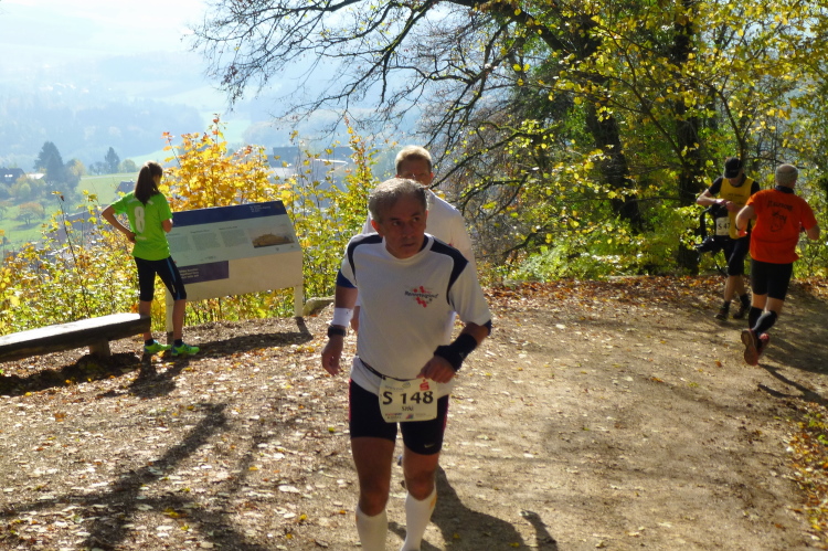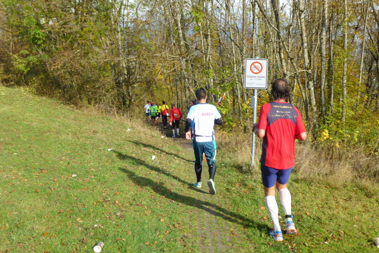 Los geht es mit der inneren Runde. Sie führt uns auf den profilmäßig wohl anspruchsvollsten Part des Albmarathons. Wem die Veranstaltung bisher zu wenig Trail-Feeling bot, der kommt spätestens hier auf seine Kosten. Zum Einstieg führt uns ein schmaler Single-Pfad zunächst noch leicht ansteigend und locker zu belaufend durch die bewaldete Bergflanke. Jäh ändert sich jedoch die Richtung und der morastige Pfad schraubt sich über Stock und Stein direkt den Hang empor. Keuchend und wortlos schleichen die Läufer, einer nach dem anderen, den steilen Abhang empor. Bei Nässe und Matsch wäre dieser Part mit normalen Laufschuhen wohl nur krabbelnd zu bewältigen. Wohl dem also, der griffige Trail-Treter unter seinen Fußsohlen hat. Auf den Gipfel (757 m üNN) kommen wir allerdings nicht, sondern erreichen lediglich einen Scheitelpunkt etwa dreißig Meter unterhalb. Das Gipfelerlebnis wäre ohnedies wohl ein eher bescheidenes gewesen, ist doch der Stuifen, bar jeder Burg, Kapelle oder sonstigem Menschenwerk, auch am Gipfel komplett bewaldet. So geht es auf einmal unvermittelt wieder talwärts, nicht mehr ganz so steil, aber seine Sinne, vor allem den Gleichgewichtssinn, sollte man auch hier stets unter Kontrolle haben.