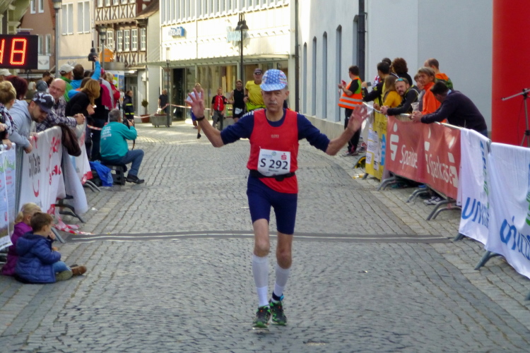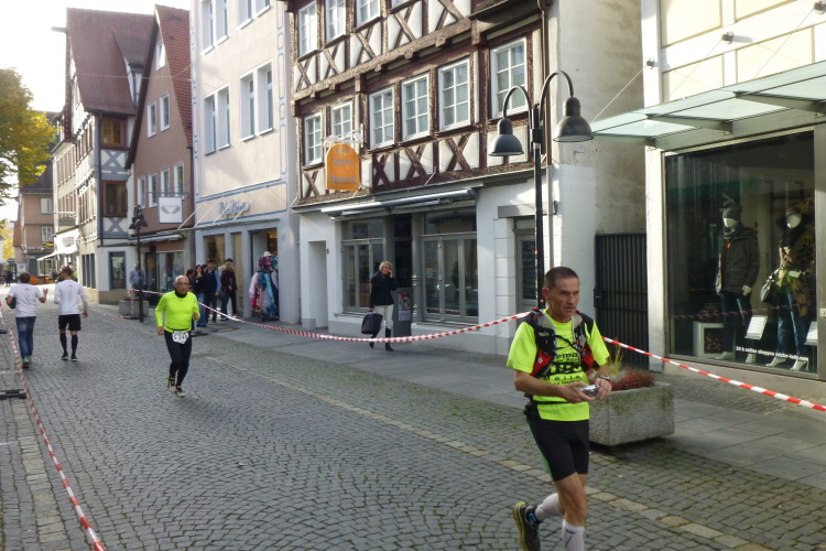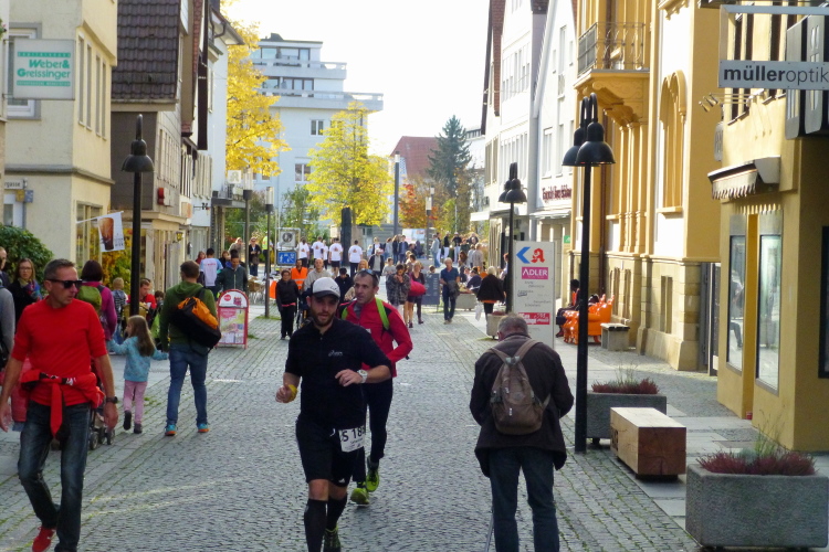 Schließlich ist es soweit: Über eine Brücke queren wir Gmünds Hauptausfallstraße und setzen über bis direkt ans Ufer der Rems. Eine letzte Erfrischung erwartet uns bei bei km 48, dann geht es entlang des stillen Flusses direkt der Altstadt entgegen. Am modernen Congress-Centrum und am Stadtgarten vorbei halte ich direkt auf den mittelalterlichen Fünfknopfturm zu. Gmünds Altstadt ist erreicht. Dem Kopfsteinpflaster der Bockgasse folgend schließt sich unter dem Zielbogen auf dem Johannisplatz vor dem Prediger der 50 km-Kreis.