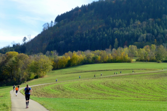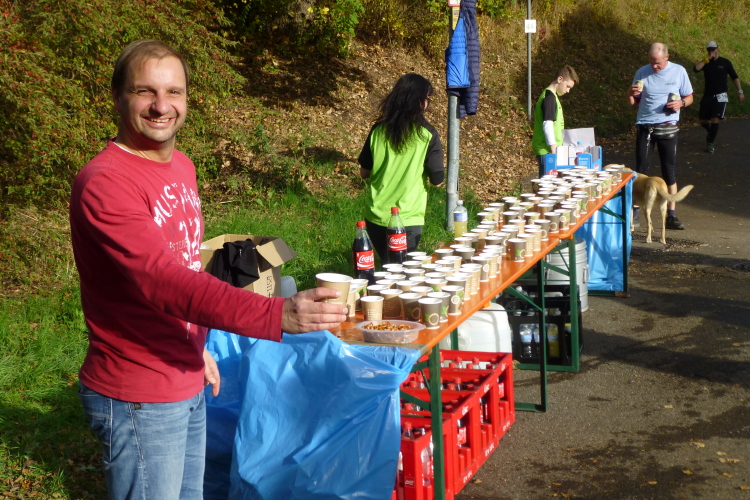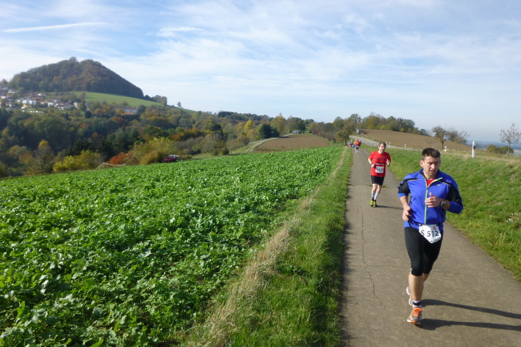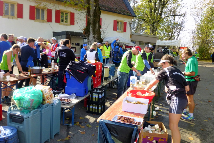 Luftliniengemessen wäre der Hohenstaufen gar nicht weit weg, doch die Veranstalter sehen eine behutsame Annäherung vor und so beschreibt der Kurs hin zum Berg einen weiten Bogen. Der führt uns zunächst durch das ruhige Wäschebeuren und dann weiter durch saftig grüne Wiesen und Felder, durchbrochen von den Farbinseln der herbstlichen Bäume. Zunächst recht flach, dann immer mehr ansteigend, geht es dahin. Näher und näher rückt der Kegel. Gerade recht kommt die Verpflegungsstation direkt am Fuße des Berges, die von einer Armada von THW-Helfern gemanagt wird.