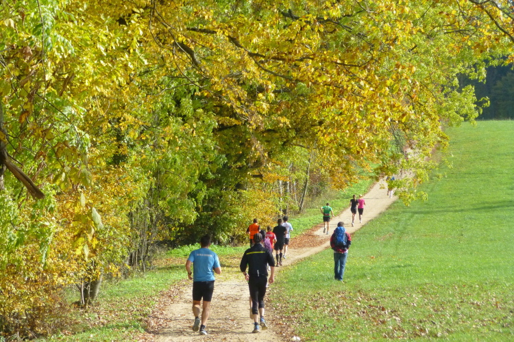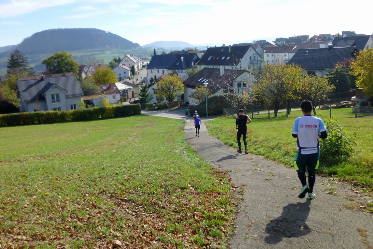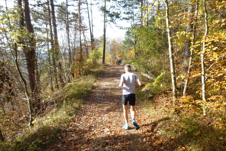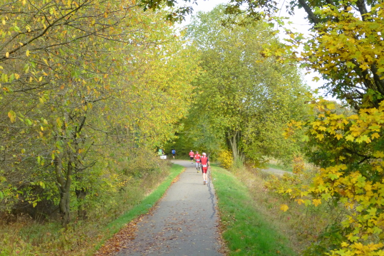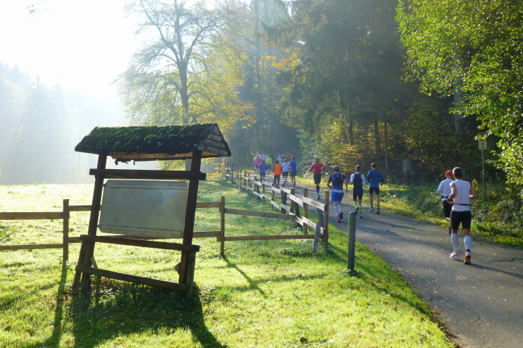 Das ändert sich erst ab km 6. Denn hier schwenken wir nach Süden ab und folgen dem Verlauf des Beutentals. Weiterhin bestimmt ein mal asphaltierter, mal geschotterter Radweg unseren Laufparcours durch Wiesen und Wälder. Zunächst nur leicht, dann aber immer stärker machen sich die Anstiege bemerkbar, doch das Laufen durch die herbstliche Natur ist weiterhin überaus entspannend.