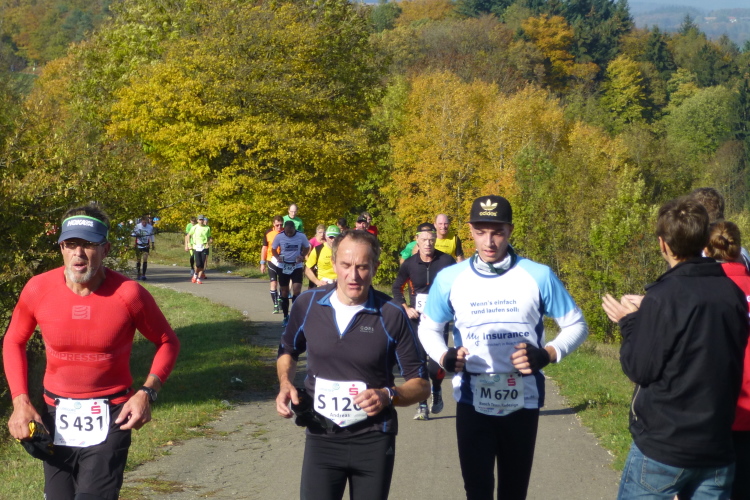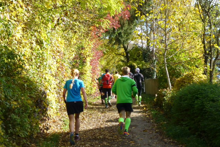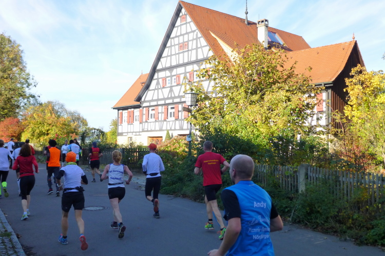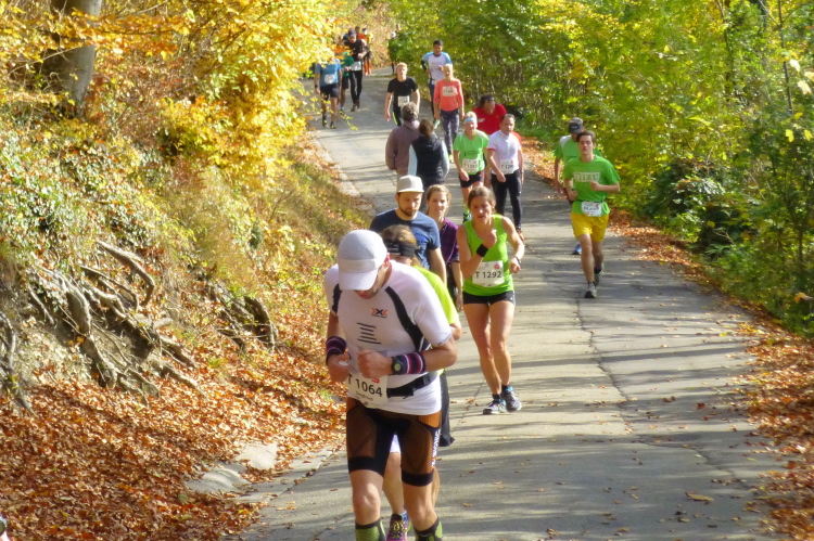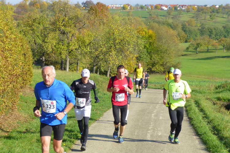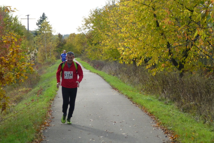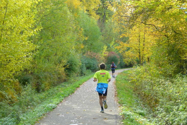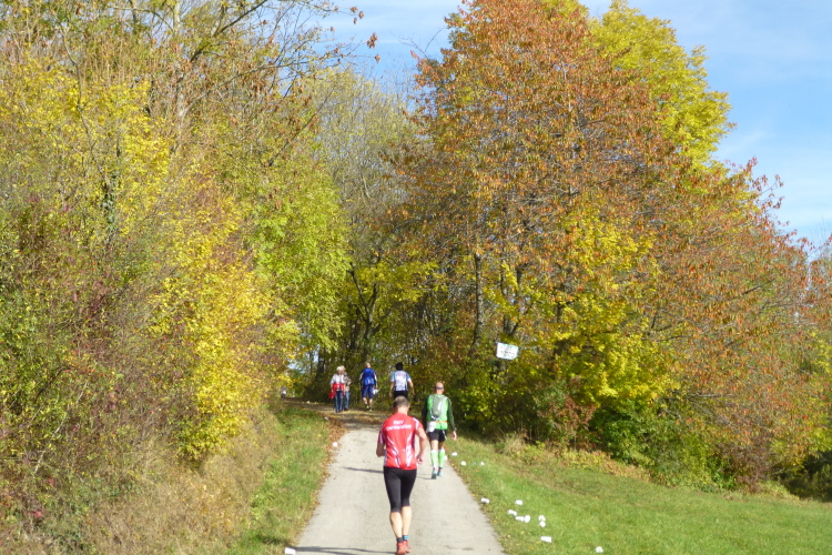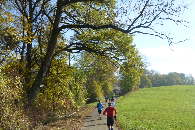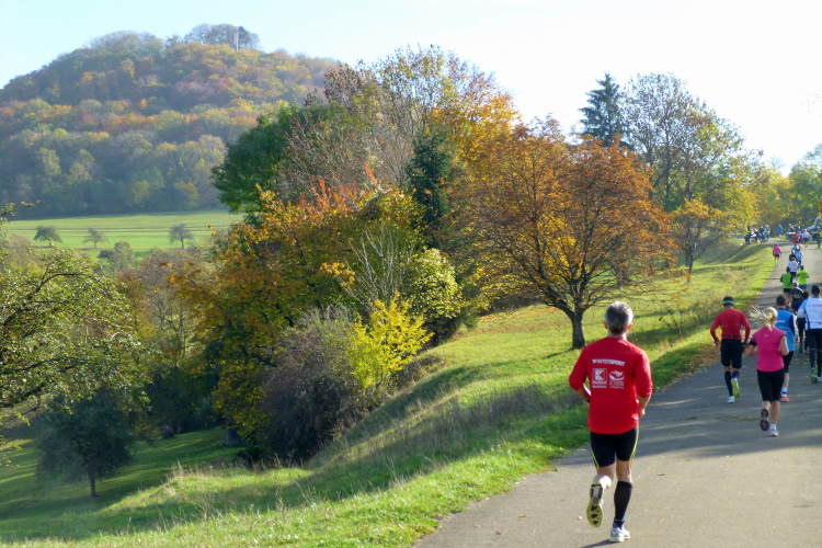 Nicht mehr lange dauert es und wir tauchen, dem Verlauf des Remstales folgend, ein in die Natur und dürfen das erleben, was – neben den drei Bergen – das Markenzeichen des Albmarathons ist: Die herbstlich, in allen möglichen Gelb- und Rottönen eingefärbten Laubwälder. Zumeist auf schmalen, für Tourenradler prädestinierten Asphaltwegen geht es in leichtem Auf und Ab dahin. Ein stetes Rauschen begleitet uns. Dessen Ursache ist allerdings nicht die Rems, die überaus still und meist unsichtbar vor sich hin fließt, sondern die B29, mit der wir uns das Naturidyll teilen müssen. Zu sehen ist von der Straße allerdings ebenfalls so gut wie nichts.