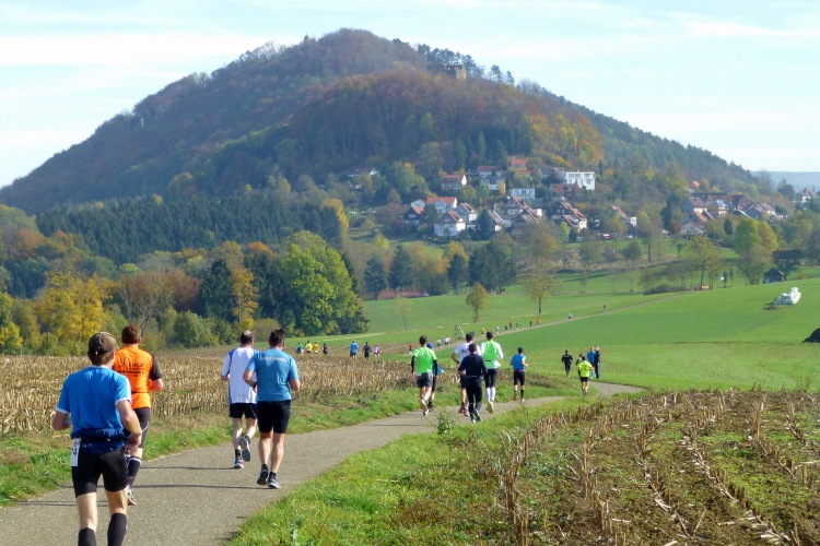 50 km – 1070 Höhenmeter – drei Berge. Das sind die zentralen Eckdaten des Albmarathons, wobei man das mit den Bergen mit alpiner Brille betrachtet nicht überbewerten darf. Aber schon vorweg: Unterschätzen sollte man die Anstiege nicht. Trailschuhe mögen auf 98 % der Strecke entbehrlich sein, wer auf sie verzichtet, könnte auf den restlichen 2 % jedoch sein "blaues“ Wunder erleben. Und die drei Berge sind auch nicht irgendwelche Berge. „Kaiserberge“ wird das Triumvirat aus Hohenstaufen, Rechberg und Stuifen genannt. Den stolzen Beinamen verdanken sie dem Umstand, dass der Hohenstaufen einst die Stammburg des Königs- und Kaisergeschlechts der Staufer trug.
