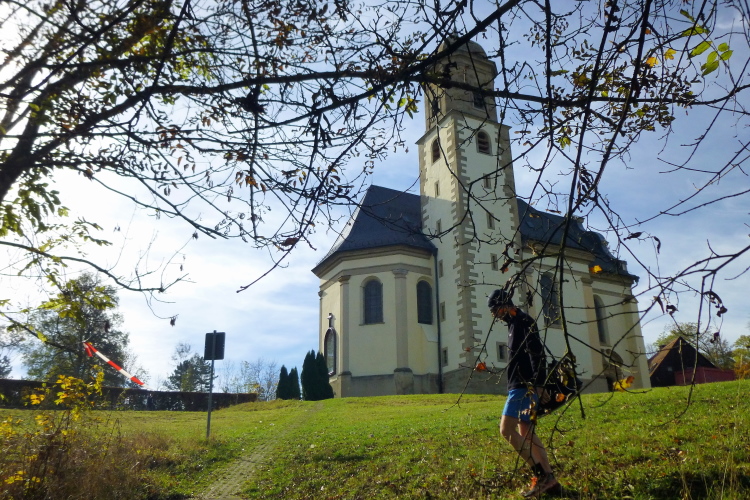 Der Verpflegungsposten kennzeichnet gleichzeitig den Abzweig zur bereits erwähnten Zusatzschleife, die ein ganz spezielles Ausflugsziel ansteuert. Ein Asphaltweg führt zunächst in einem Bogen weg vom Stuifen, bis wir bei Tannweiler ein letztes Mal einen steilen Weg den Hang hinauf nehmen müssen. Erst oben angekommen wird unser Ziel sichtbar: Die winzige, dem Heiligen Leonhard geweihte Reiterleskapelle. Dreihundert Jahre alt ist die Kapelle, doch die ausladende Linde, die sie fast schon umschlingt, soll nochmals hundert Jahre älter sein. Auf einem lauschigen Waldpfad, dann weiter auf dem schon bekannten Asphaltweg geht es zurück zum Verpflegungsposten und damit zum Stuifenrundkurs. Gut 35 km sind geschafft. Und ich bin es auch.