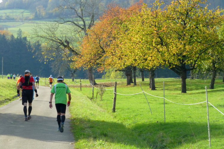 Landschaftlich so richtig schön und abwechslungsreich sind einmal mehr die nächsten Kilometer. Im Licht der Nachmittagssonne feiert die herbstliche Natur weitere Farborgien. Auf einsamen Wegen geht es tendenziell bergab, auch wenn mich immer wieder kleine Gegenanstiege ausbremsen. Mal geht es vorbei an knorrigen Obstbäumen, mal über raschelnde Laubteppiche in dichtem Wald. Friedlich grast eine Herde Lamas auf einer Weide. Stetig neue Perspektiven und Ausblicke eröffnen sich vor meinen Augen. Eine Perspektive der besonderen Art ist auch der frische Käsekuchen, den eine freundliche Helferin an der Verpflegungsstelle bei km 38 den begeisterten Ankömmlingen kredenzt. Vorbei an Waldstetten cruisen wir durch die Natur bis Straßdorf, wo wir uns doch tatsächlich für 200 Meter den Weg mit einer richtigen Straße teilen müssen.