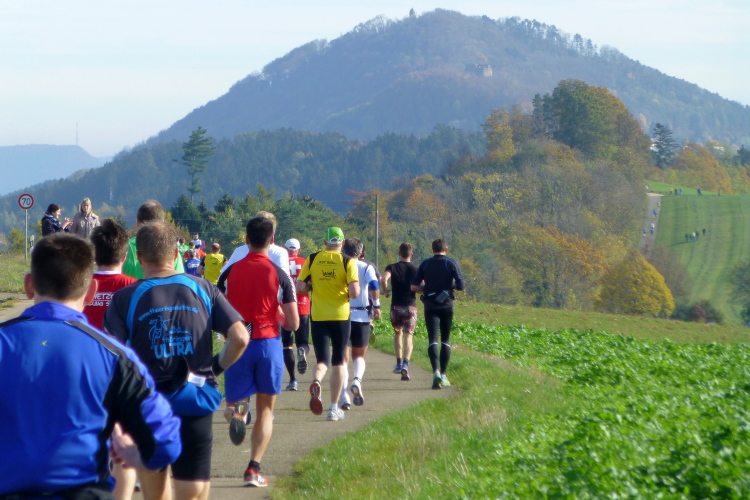 Bis weit zum Horizont zu überblicken ist das schmale Asphaltband des sich durch Wiesen und Felder windenden Radweges, auf dem sich die Läufer als kleine bunte Punkte verlieren. Immer deutlicher baut sich der Stuifen vor uns auf. 28 km liegen hinter mir, als ich die Dreifachweiche am Fuße des Stuifen erreiche. Ein wildes Geflecht von lila Pfeilen am Boden markiert, wer wohin zu laufen hat. Da nicht jeder Läufer so viel Abstraktionsvermögen besitzt, das Pfeilrätsel richtig zu lösen, dirigieren zudem Helfer die jeweils Ankommenden in die richtige Richtung, während ein Trupp Sanitäter entspannt dem Sonnenbad frönt. Zu tun gibt es für sie zum Glück nichts.