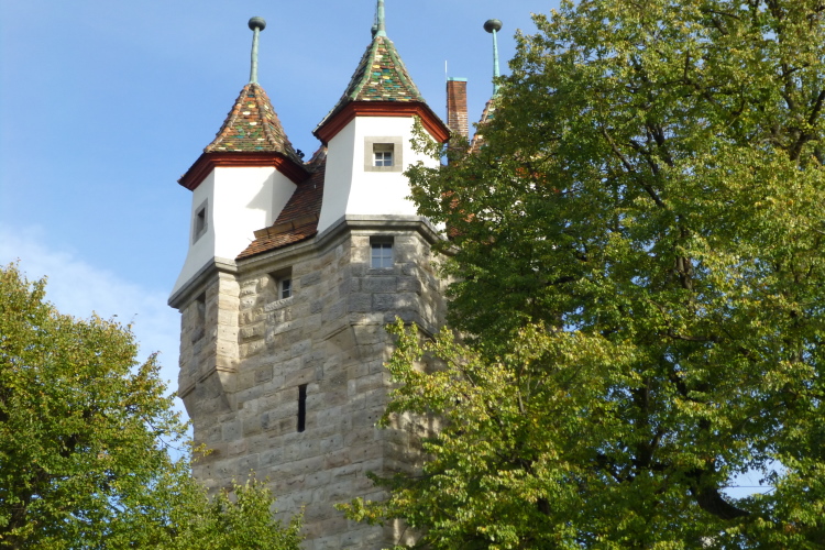 Nur ein paar Schritte weiter biegen wir schon ein auf den Marktplatz, den Mittelpunkt der Gmünder Altstadt, ein. Schöne Patrizierhäuser in einem Stilmix aus Fachwerk, Barock und Rokoko, säumen den langgezogenen Platz. Aber im allgemeinen Getümmel dürften wohl die wenigsten Gedanken oder Blicke auf diese Umgebung verschwenden. Ehe wir uns versehen, verlassen wir am anderen Ende über die Ledergasse den Platz schon wieder und erreichen kurz darauf das westliche Ende der Altstadt.
