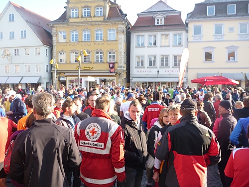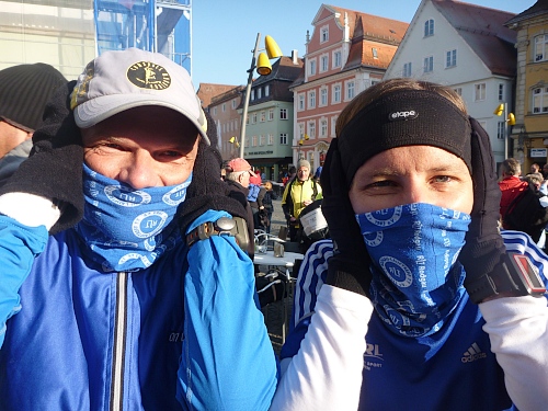Km 10 Wäschbeuren (Beuren= altdeutsch für Häuser), Verpflegungsstelle. Ich habe alle Hände voll zu tun: 2 Becher warmen Tee für Didi, zwei für mich und nebenbei Fotos schießen, der Leser will ja informiert sein.