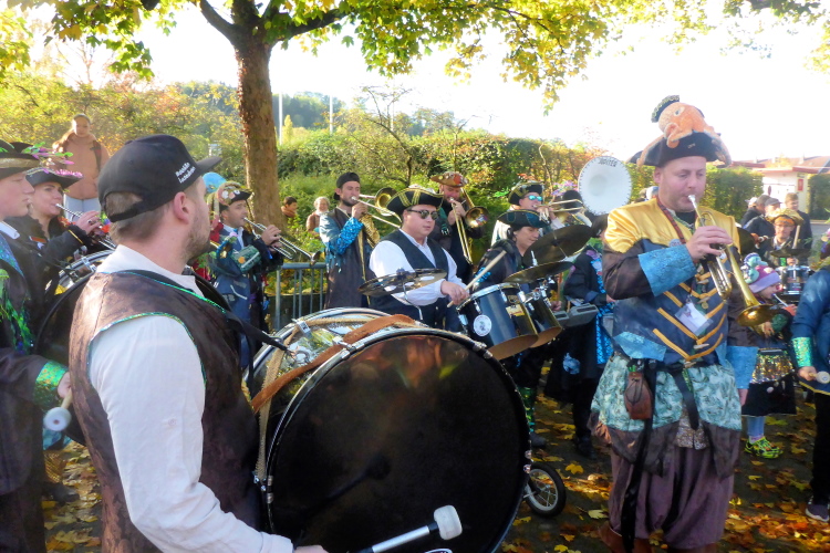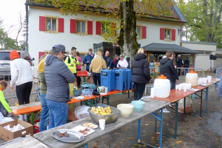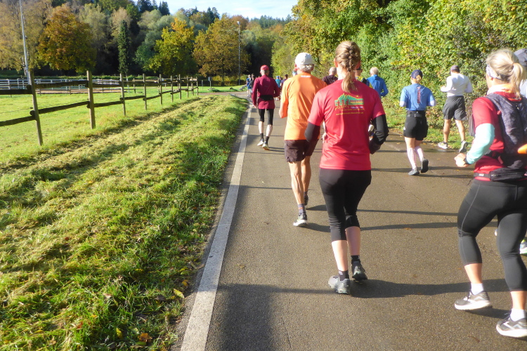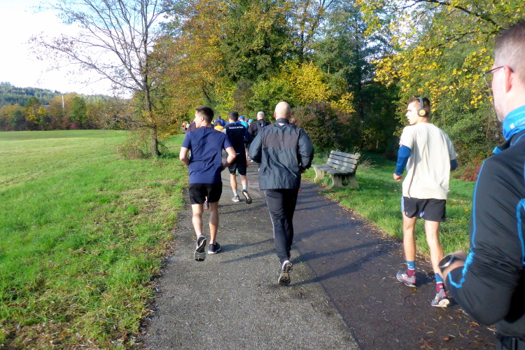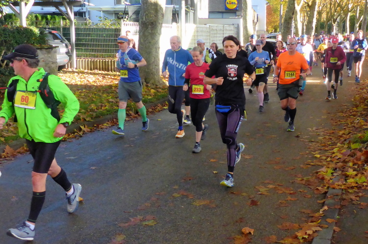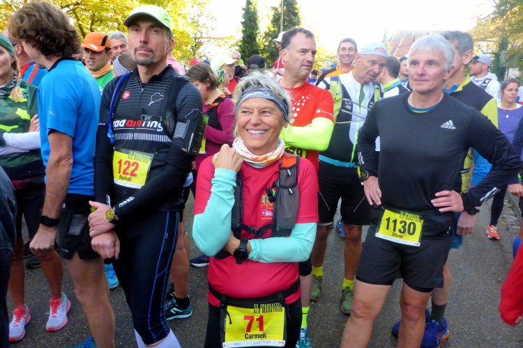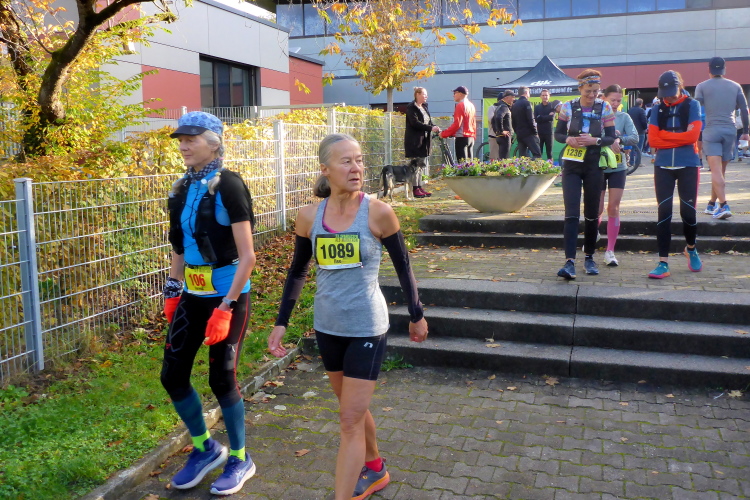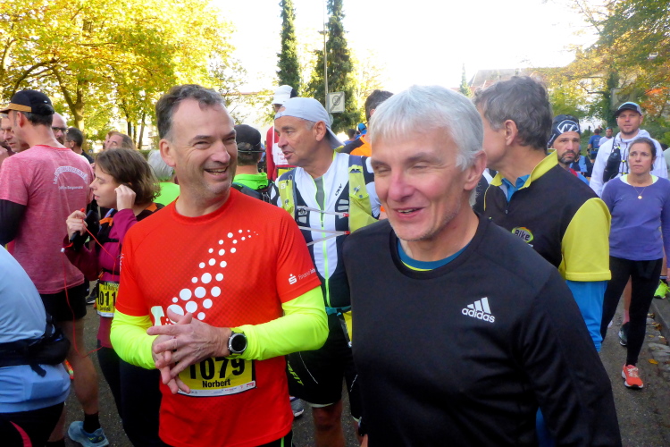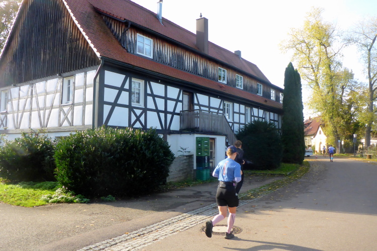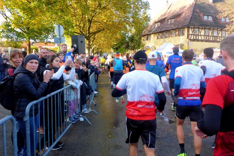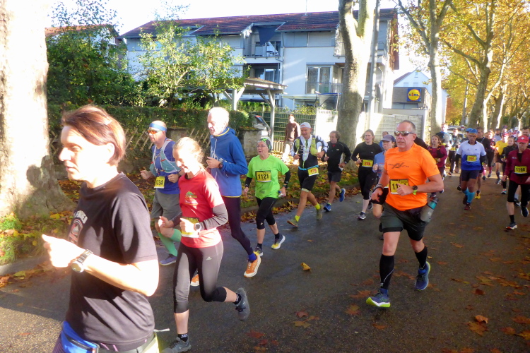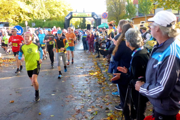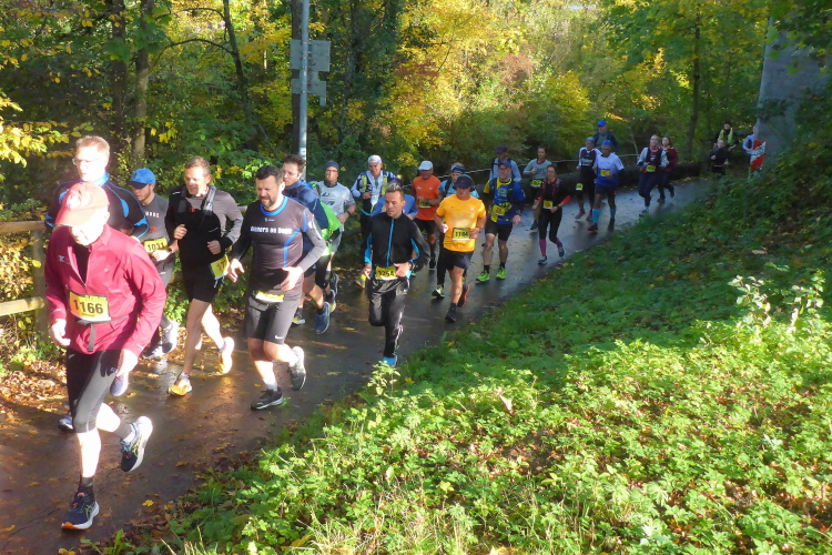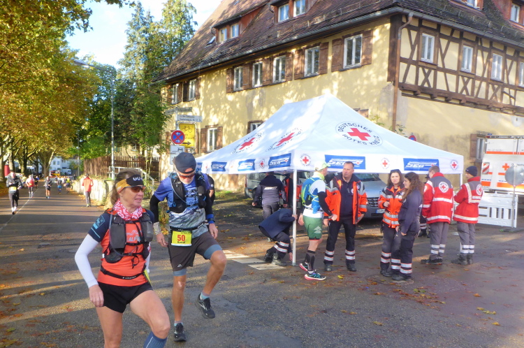 Um 10 Uhr ist der Start für die 50 km und die 25 km. Eine originell kostümierte Musikkapelle sorgt hinter dem Startbogen für Stimmung. Zuerst laufen wir aus flacher Strecke aus dem Ort hinaus, nach einem Kilometer geht es durch eine Grünanlage entlang der Rems.