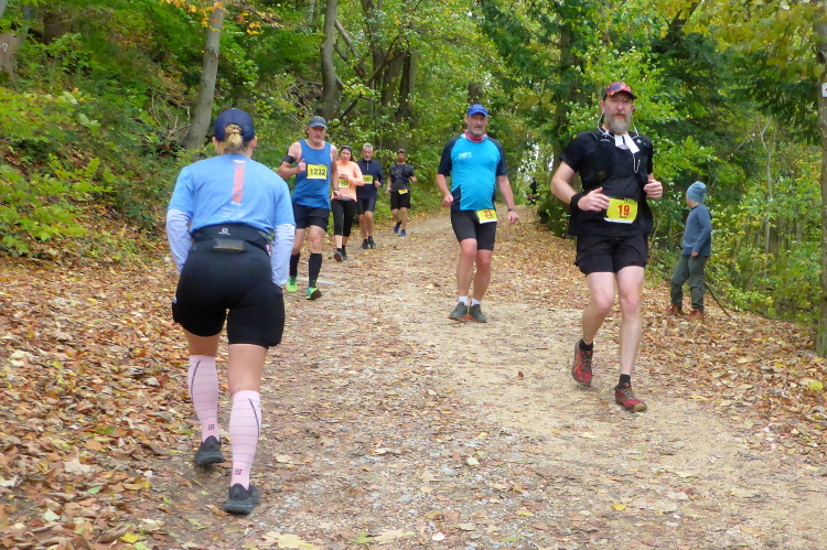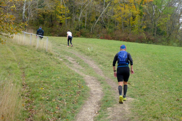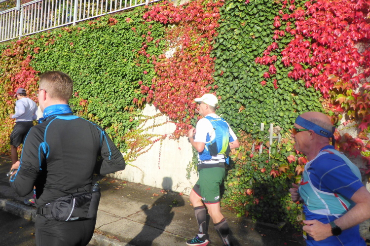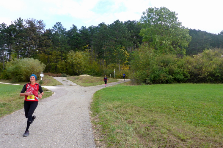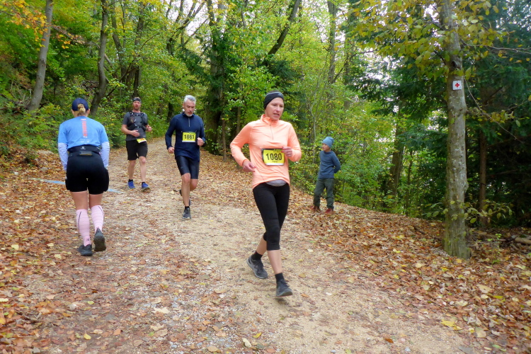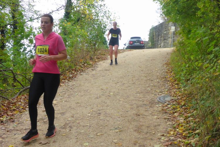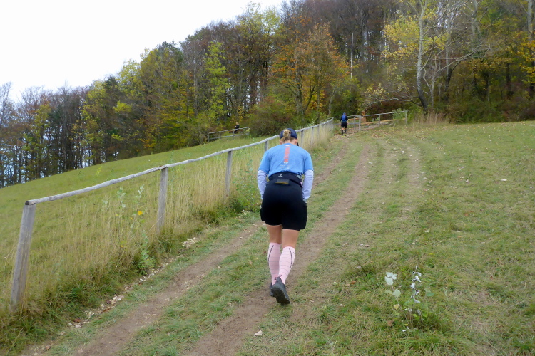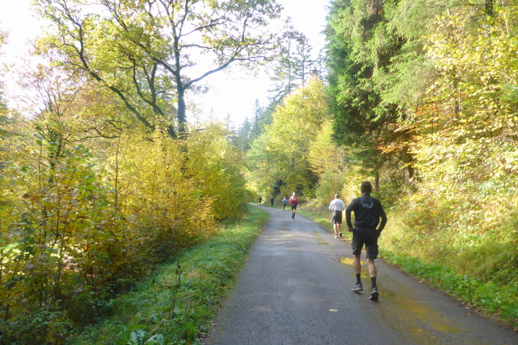 Bei km 3,4 beginnt der erste von vielen Aufstiegen. Teils laufe ich, teils wechsle ich in schnelles Marschtempo, so wie auch viele andere um mich herum. Nach 500 m kann ich bereits wieder bergab rennen.