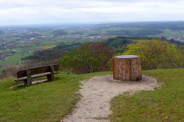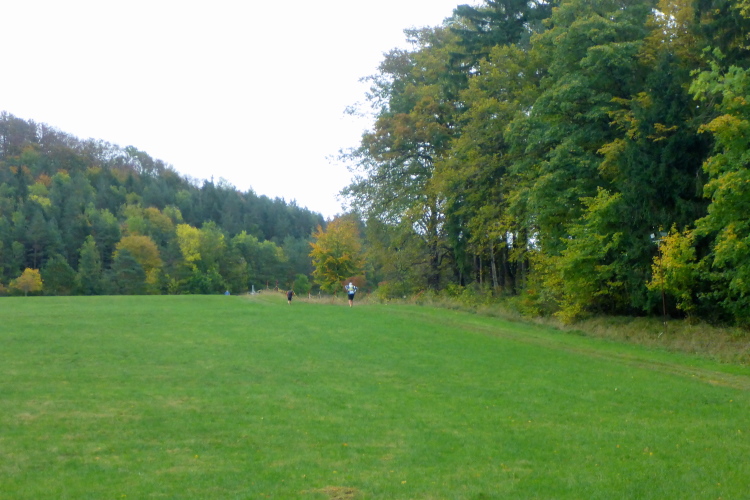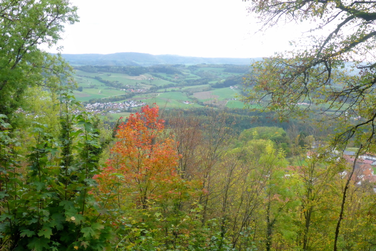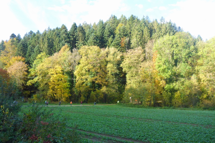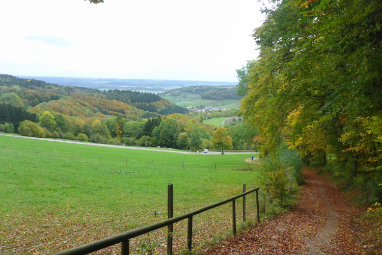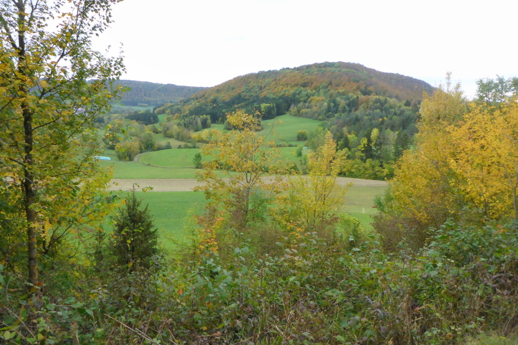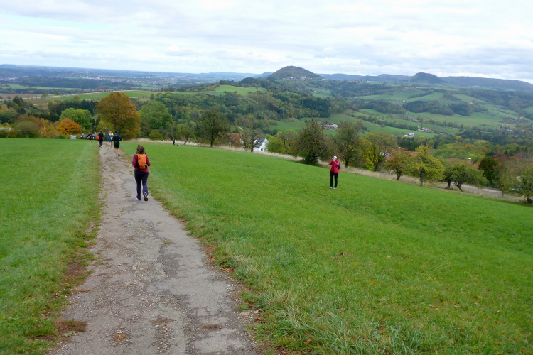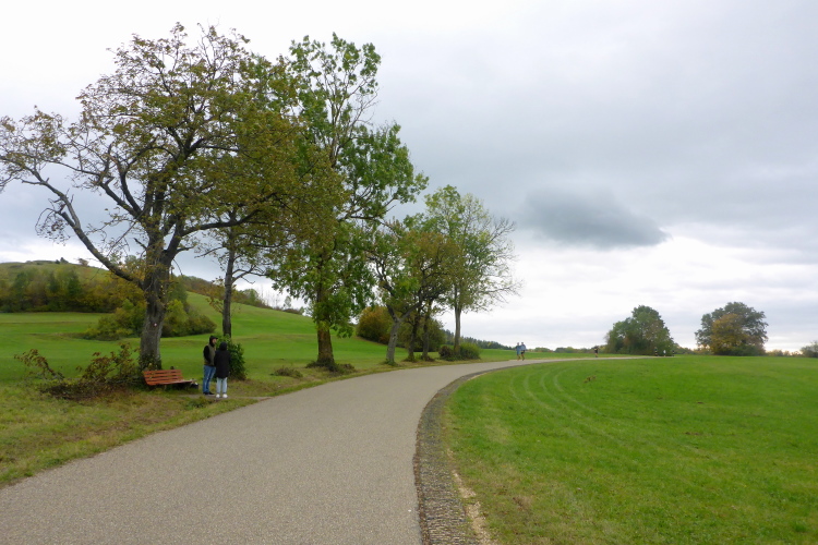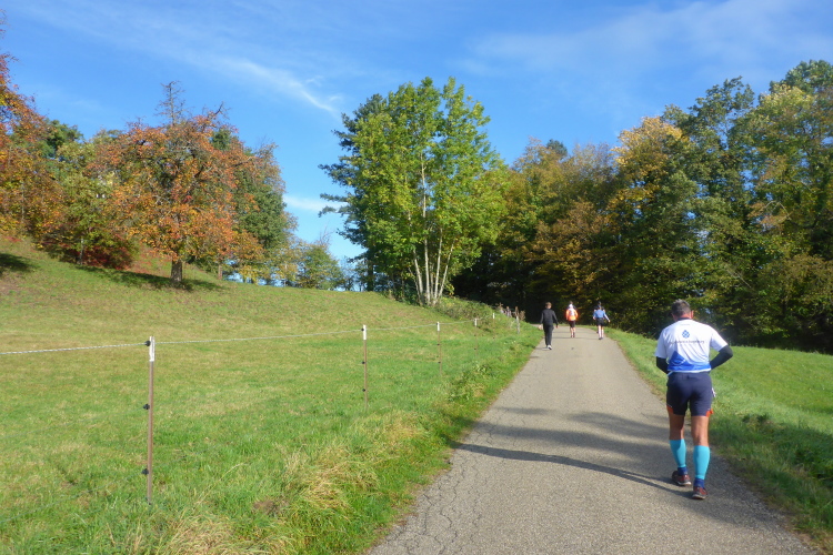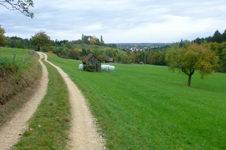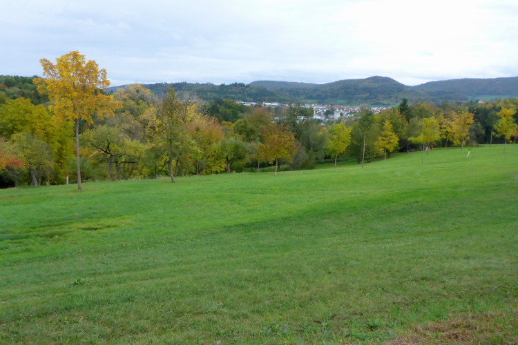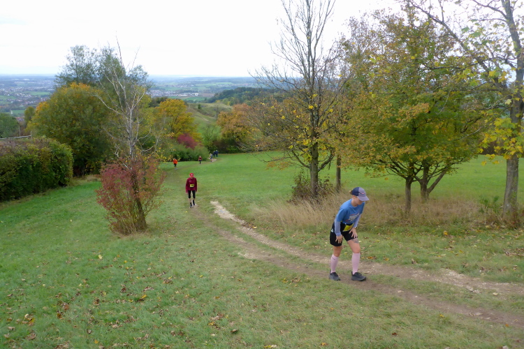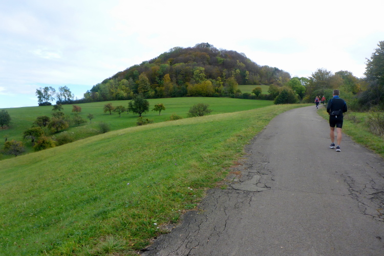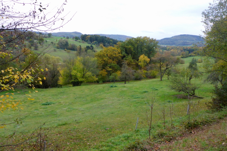 Es folgen einige Kilometer ohne allzu große Höhenunterschiede, mal über Feldwege, mal Asphalt oder Betonplatten, immer über sonnige Streuobstwiesen mit Herbstfarben und schooner Aussicht. Was für ein schöner Oktobertag!
