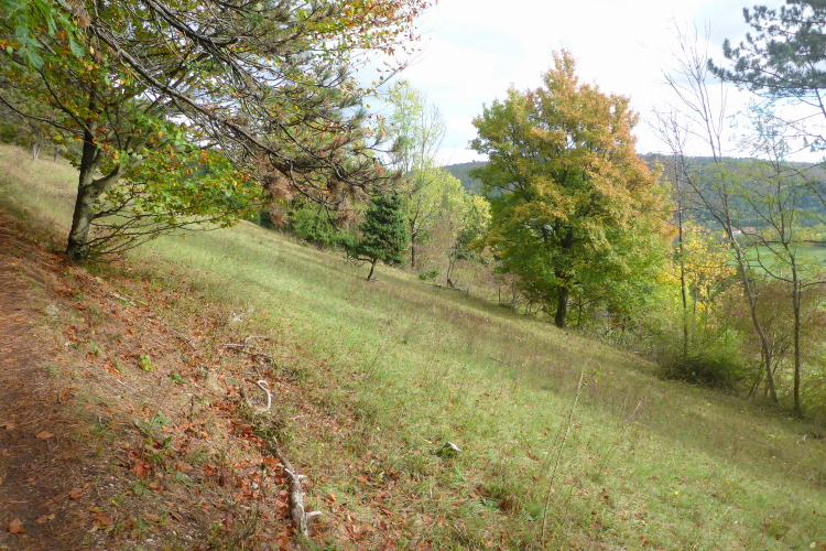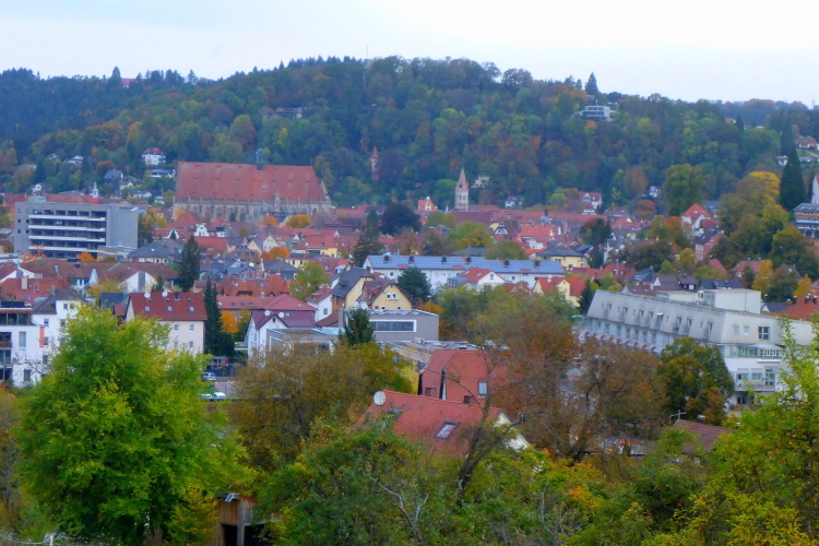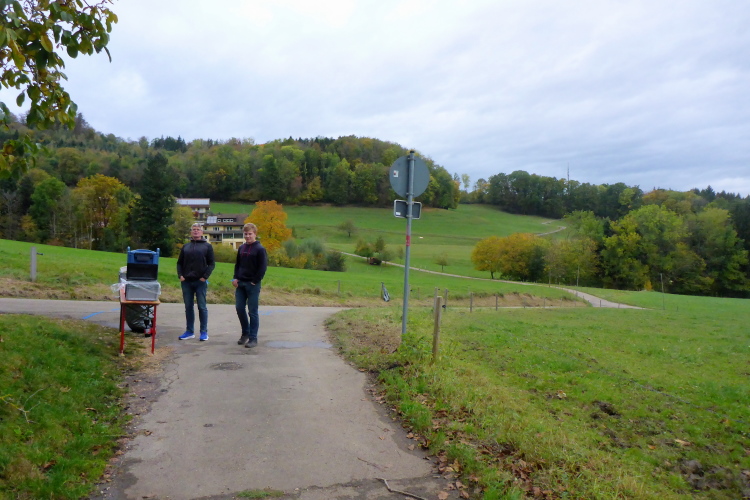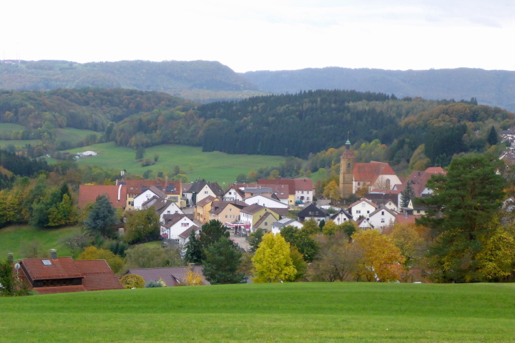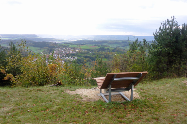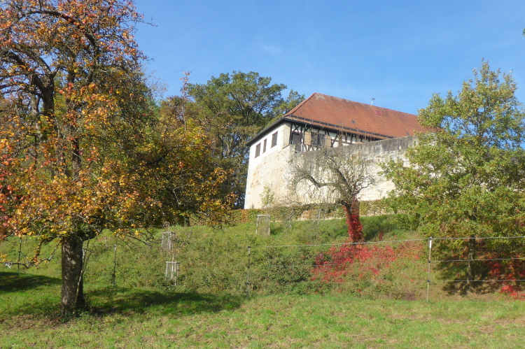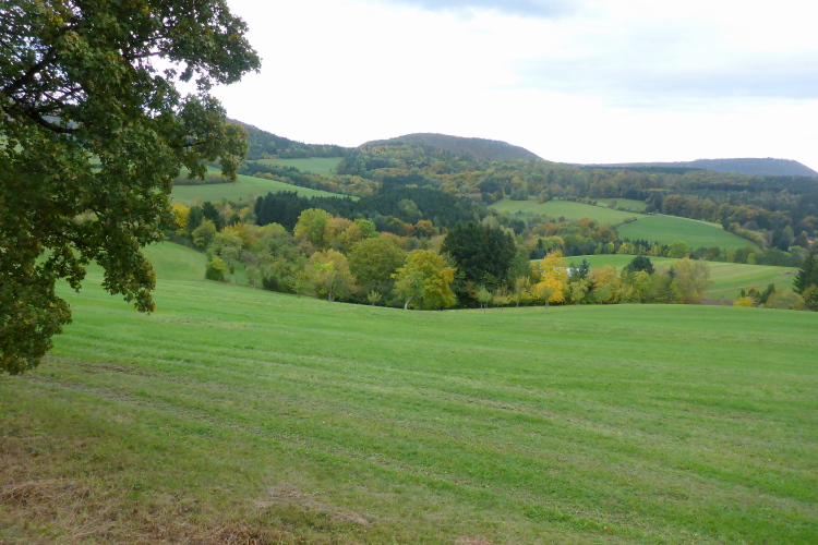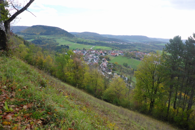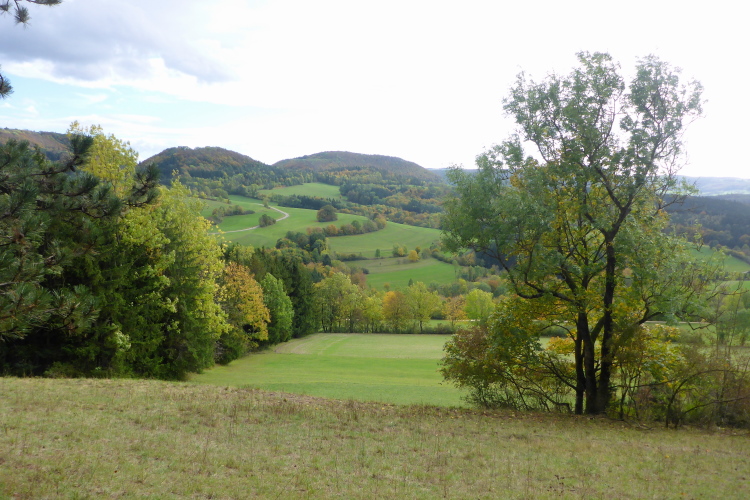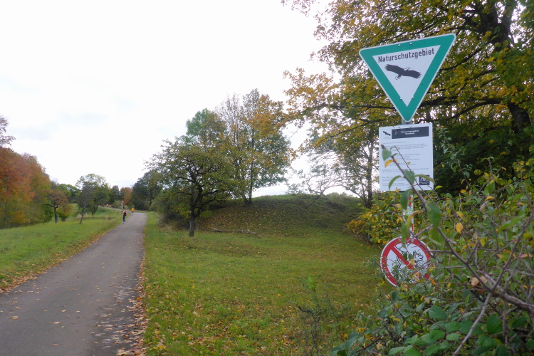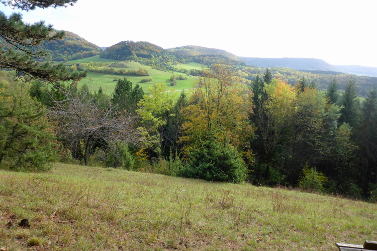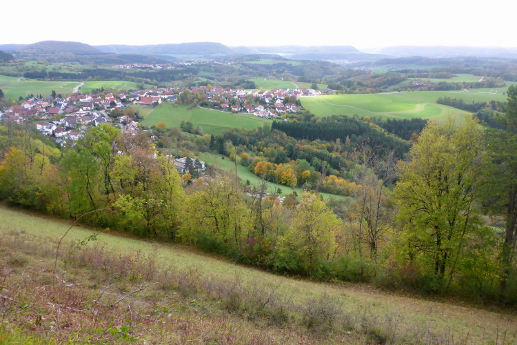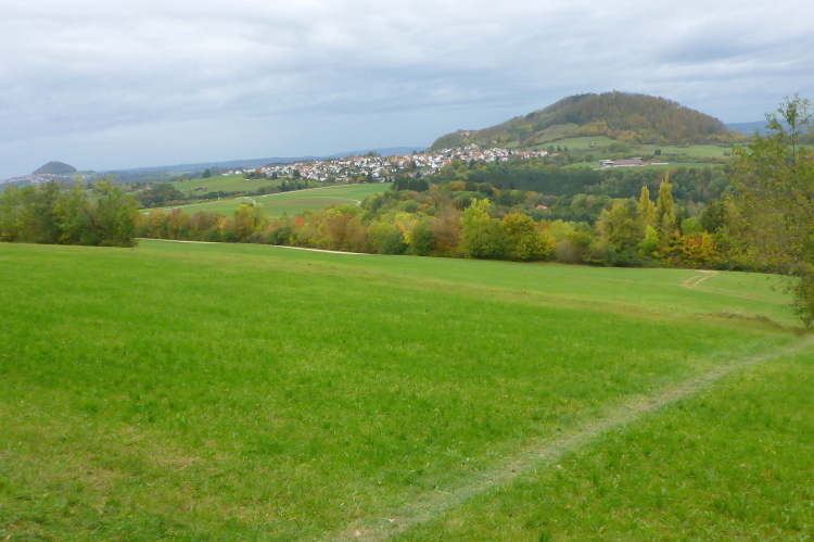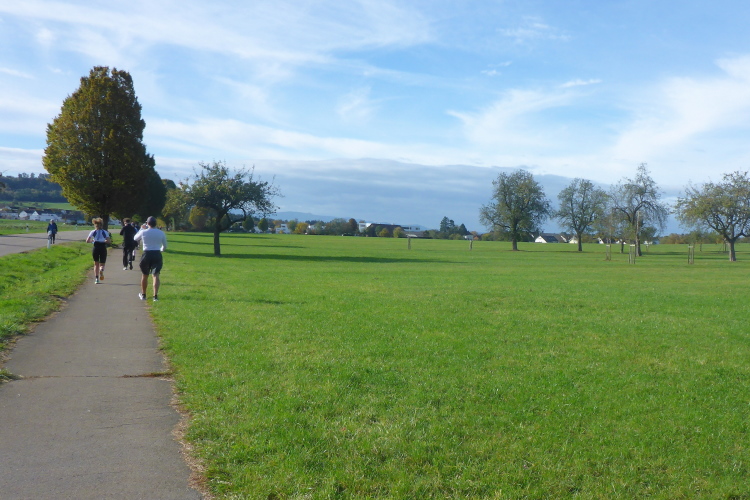 Es folgen einige Kilometer ohne allzu große Höhenunterschiede, mal über Feldwege, mal Asphalt oder Betonplatten, immer über sonnige Streuobstwiesen mit Herbstfarben und schooner Aussicht. Was für ein schöner Oktobertag!