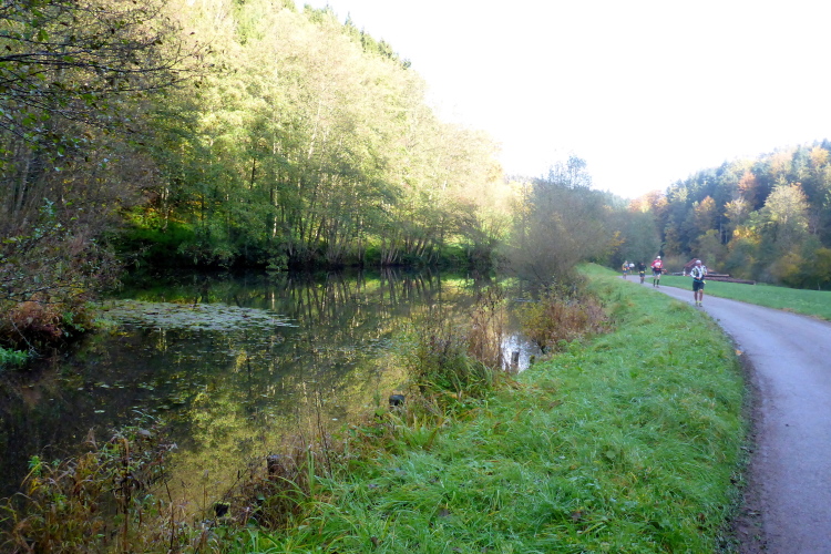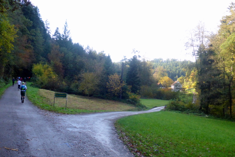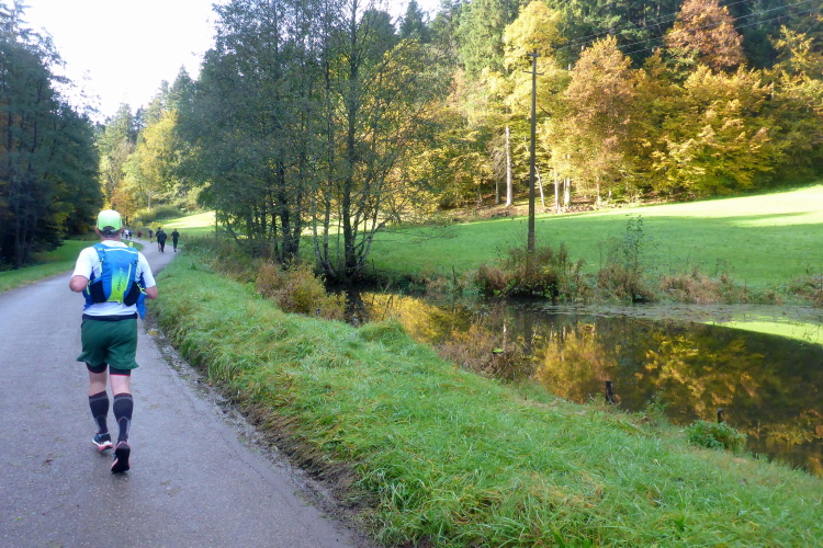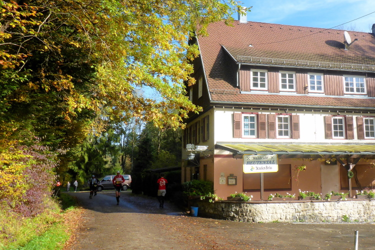 Überraschend gibt es heute mehr Verpflegungsstellen als in der Ausschreibung angekündigt. Schon nach einer Stunde erreiche ich die erste. Nun führt die Strecke durch das Beutental. Ich komme am Beutenhof, einem kleinen Fischteich und am Waldcafé Beutental vorbei.