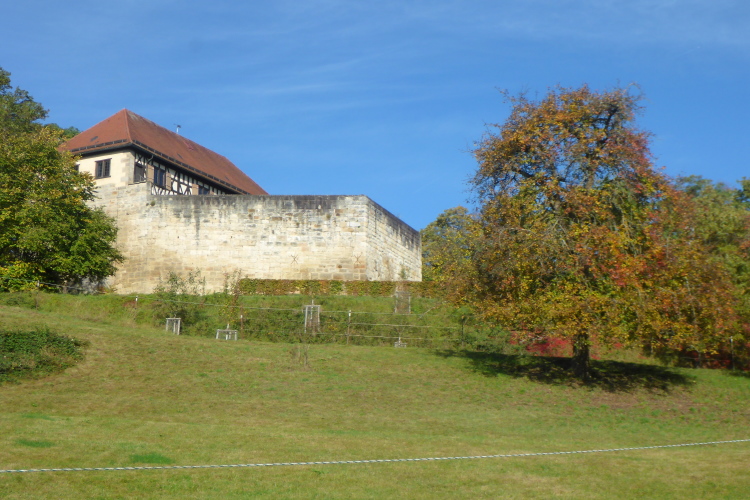 Den nächsten Aufstieg könnte ich eigentlich komplett laufen, aber ich spare mir meine Kraft und reduziere das Tempo. Bald erreiche ich Burg Wäscherschloss, auch Wäscherschlössle genannt. Schon im 11. Jahrhundert stand hier ein Wohnturm, der dann im 13. Jahrhundert zur Burg erweitert wurde. Die aus Buckelquadern erbaute Umfassungsmauer stammt noch aus dem 13. JH, der Eingangsbereich wurde aber nach einem Einsturz im Jahr 1915 neu errichtet. Ein Teil des mittleren Stockwerks wird durch Fachwerk aus dem 15. JH geziert.