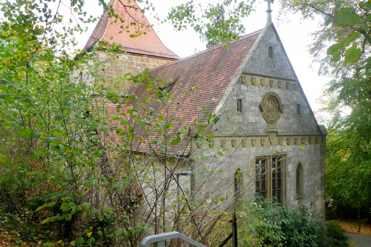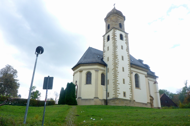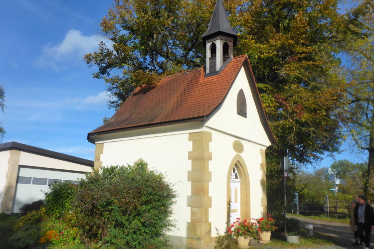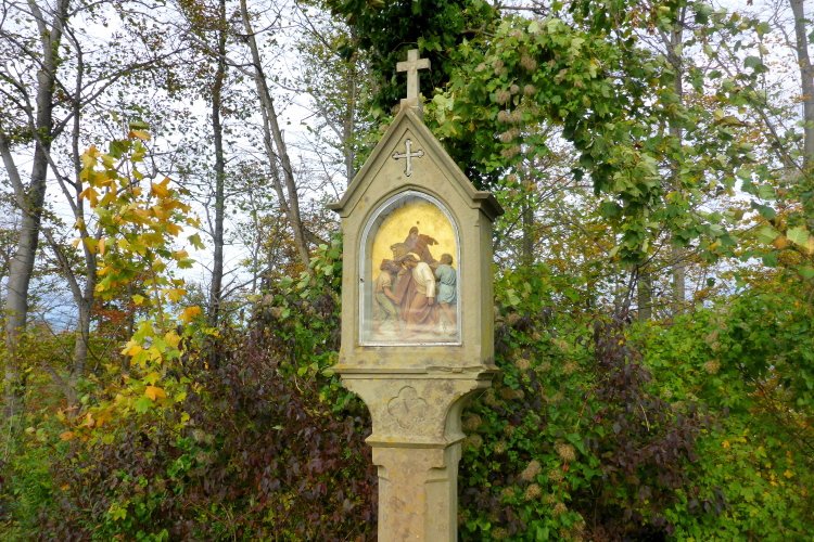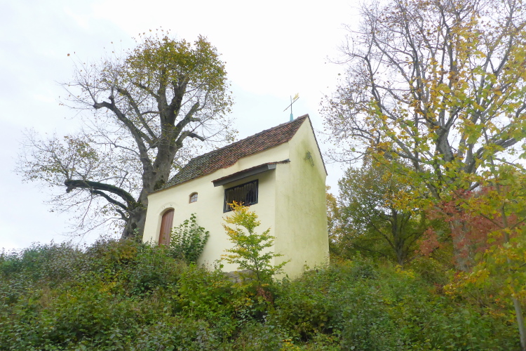 Die nächste Wegschleife führt unter anderem zur Reiterleskapelle. Zweimal laufe ich bei diesen Schleifen unterhalb des Schönberg vorbei, auf dem eine kleine Wacholderheide wächst.