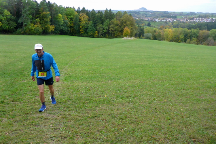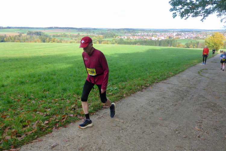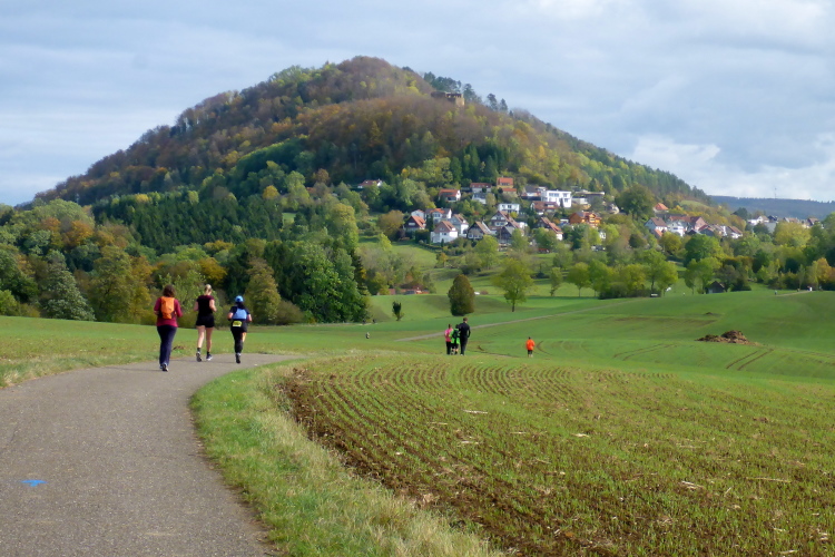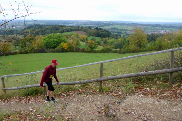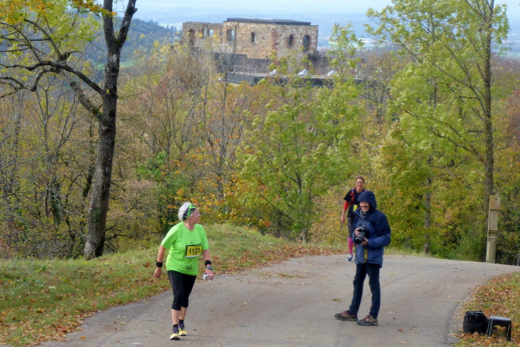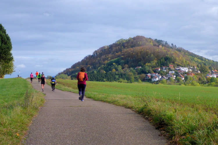 Dann erreiche ich die erste von mehreren Stellen, an denen mir heute Läufer begegnen, die schon viel Vorsprung haben. Der Marsch auf den Hohenstaufen (684 m) ist eine Wendepunktstrecke. Ausgrabungen bewiesen, dass der Gipfel schon mindestens seit der Merowingerzeit, vermutlich sogar seit der Bronzezeit bewohnt war. Lange Zeit dachte ich, der Name Hohenstaufen stamme von dem Königs- und Kaisergeschlecht der Staufer, das hier seinen Stammsitz hatte. In Wahrheit ist es genau umgekehrt. „Stauf“ wurden früher hohe, spitze Bergkegel genannt. Herzog Friedrich I. von Schwaben war der erste, der sich nach Burg und Berg nannte. Danach war der Hohenstaufen bis Mitte des 13. Jahrhunderts Stammburg des Königs- und Kaisergeschlechts der Staufer.
