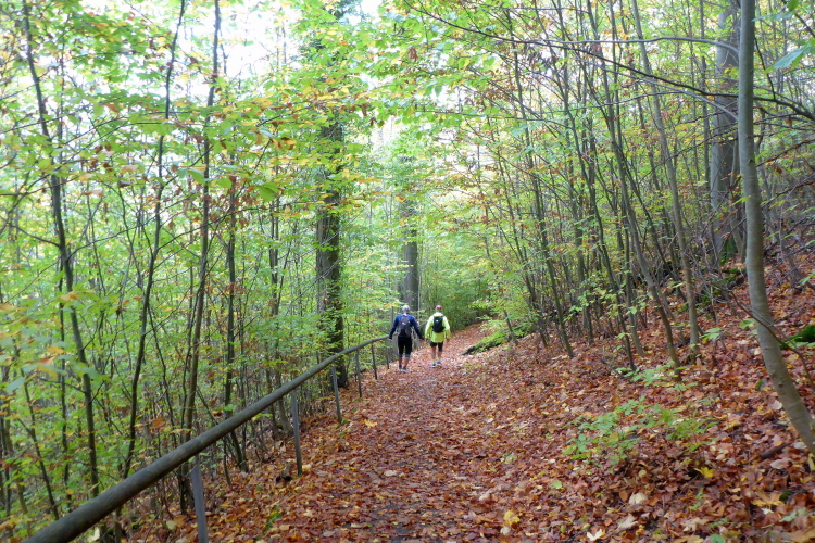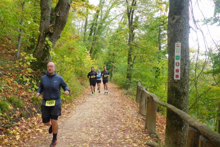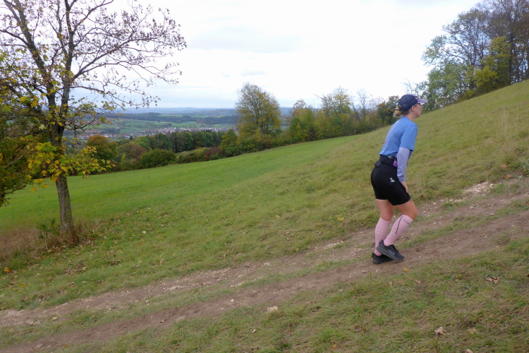 Mein Trailrunnerherz freut sich über einen 1,4 km langen herrlichen Single-Trail, der zuerst relativ flach durch den Wald und zu Wiesen mit Aussicht führt, dann aber mit einem wirklich knackigen Aufstieg endet. Unsere Route führt nicht ganz hinauf zum Gipfel des 757 m hohen Stuifen, sondern in 719 m Höhe unterhalb vorbei.