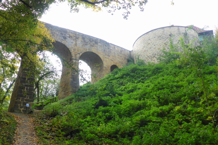 Etwa 5 km weit geht es wieder mit meist nur leichten Auf- und Abstiegen sowie viel Aussicht weiter. Dann folgt ein etwas steilerer Aufstieg zu Burg Hohenrechberg, die wir aber nicht direkt erreichen, sondern bei der wir nur unter der Brücke zum Eingang hindurch laufen. Anfang 13. Jahrhundert wurde sie als staufische Dienstmannenburg erbaut. Nachdem sie den Bauernkrieg und weitere Kriege trotz mehrerer Besetzungen überstand, fiel sie nicht menschlicher Gewalt, sondern der Natur zum Opfer, als sie 1865 nach einem Blitztschlag abbrannte.