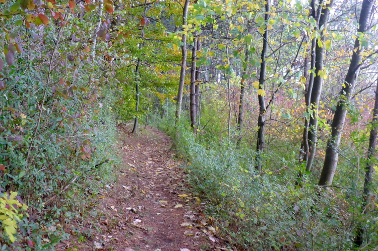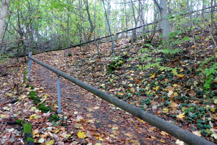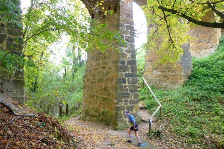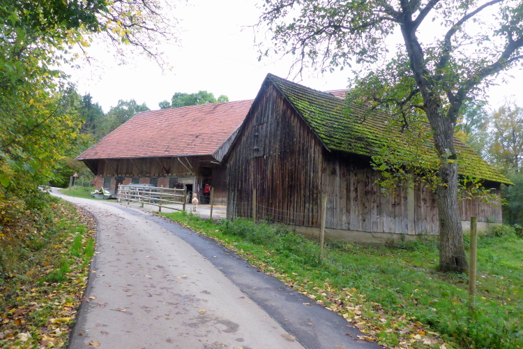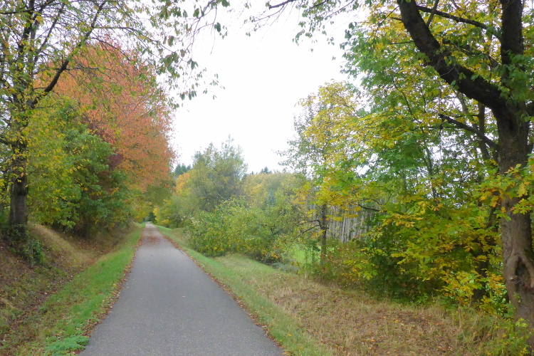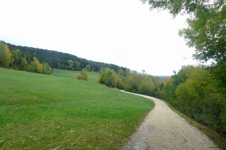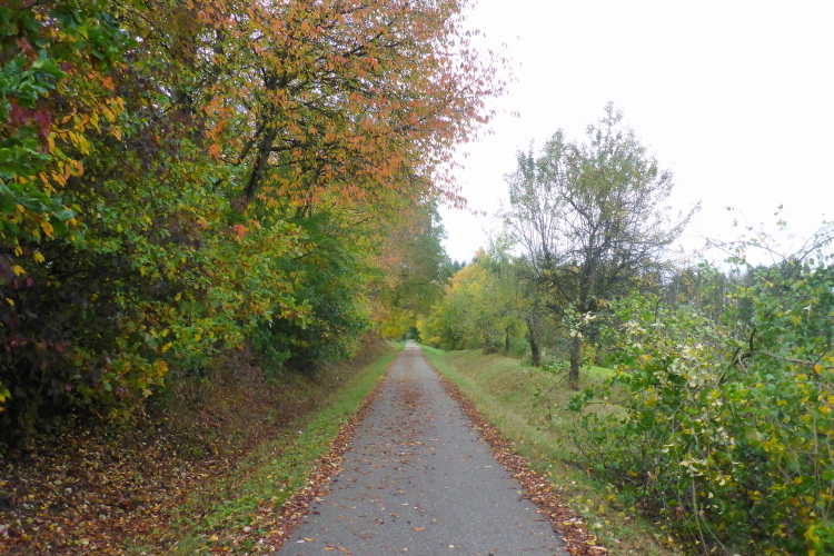 Etwa 4 km weit kann ich nun ganz bequem und mit nur minimalen Gefälle der Trasse der ehemaligen Hohenstaufenbahn folgen. Seit 1990 führt ein Fahrrad- und Wanderweg über den Bahndamm der 1984 stillgelegten Verbindung. Bisher war die Strecke hervorragend markiert, doch hier irritiert es mich, dass an zwei Stellen markierte Wanderwege hinab nach Schwäbisch Gmünd abzweigen, aber keine blauen Pfeile am Boden anzeigen, welchen ich nehmen muss. Egal, ich kenne mich aus. Die letzten Kreuzungen sind dann wieder klar markiert.