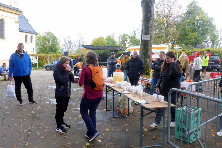 Nach dem Abstieg erreiche ich bald die nächste Verpflegungsstelle. Da es nun über zwei weitere Wegschleifen geht, ist diese sowohl für km 32,2 als auch für km 37,5 zuständig. Hier begegne ich vielen Leuten, die schon eine Stunde Vorsprung haben.