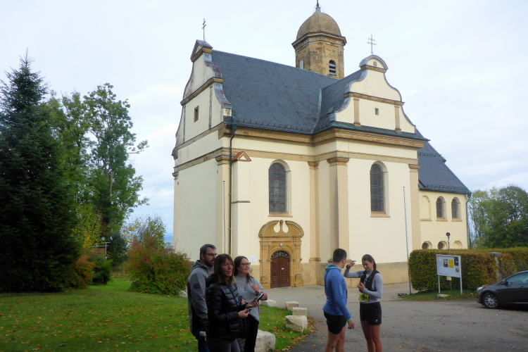 Ein Kreuzweg führt mich weiter auf den 700 m hohen Gipfel und zur barocken Wallfahrtskirche St. Maria Hohenrechberg. Hier ist die größte Verpflegungsstelle und das Ziel der 25 km Strecke. Anders als bei vielen anderen Laufveranstaltungen kann man hier auf halber Strecke entscheiden, ob man sich den Rest zutraut oder lieber nur für die kürzere Distanz gewertet werden will. Marathonis, die am Hohenrechberg schon aufhören wollen, zählen daher nicht als DNF sondern als 25 km Finisher und fahren mit dem Bus zurück.