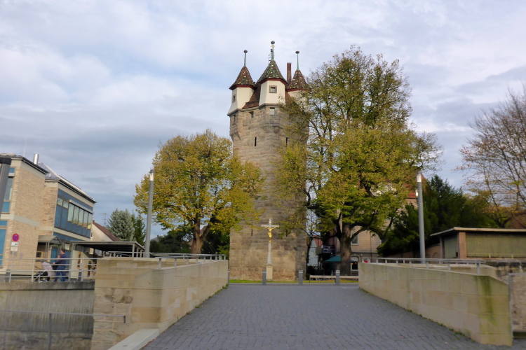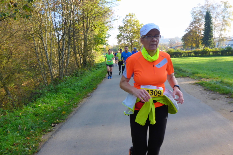 Noch gute 7 km sind zu laufen. Das letzte Stück wird zu einer mentalen Herausforderung. Der Radweg zieht sich gleichförmig Kilometer um Kilometer in Halbhöhenlage durch herbstliche Streuobstwiesen. Hier kann ich nochmal ein paar Läufer überholen, das ist schön. Laura allerdings ist nicht zu sehen. Irgendwann erscheinen rechts im Tal die ersten Häuser von Schwäbisch Gmünd. Unendlich lange laufen wir so immer in Sichtweite des nahen Ziels. Gut, dass es leicht bergab geht.