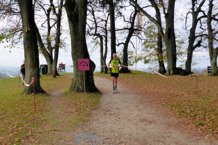 Oben geht es links und dann rechts um einen Baum herum. Achtung, Startnummer gut sichtbar machen! Hier ist Videokontrolle. Sonst würden sich vielleicht ein paar müde Läufer den Aufstieg auf den 684 m hohen Gipfel ersparen. Die Fernsicht ist hervorragend, obwohl es ein wenig diesig ist. Auf einer Tafel wird das Panorama erklärt, aber ich habe keine Zeit dafür. Für mich geht es jetzt auch bergab. Das Gefälle ist gerade so, dass man noch laufen kann. Die letzten Läufer kommen mir entgegen. Unten wartet der Besenradler. Klar, er spart sich den Aufstieg.