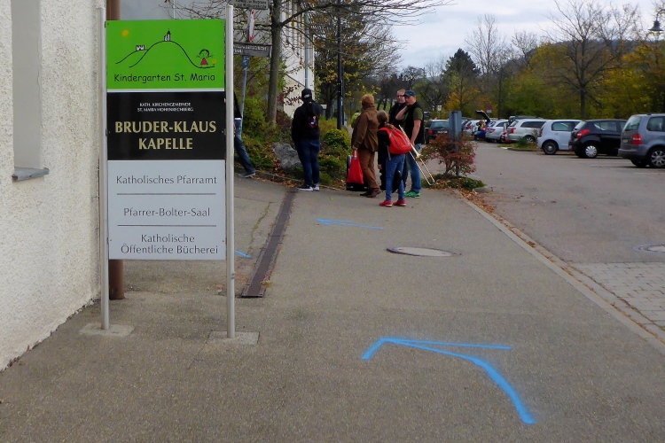 Es geht ca. 3 km wellig geradeaus zunächst im Wald, dann auf freiem Feld. Wenigstens kommt der Rechberg nun schnell näher. „Bitte lächeln und laufen“, sagt der Fotograf. Im Ort geht es bergauf. Oben kann ich Laura erkennen. Als ich ebenfalls die Anhöhe erreiche, wird es kurz flach bis zum Heim der Bruder Klaus Kapelle und dem katholischen Gemeindezentrum.
