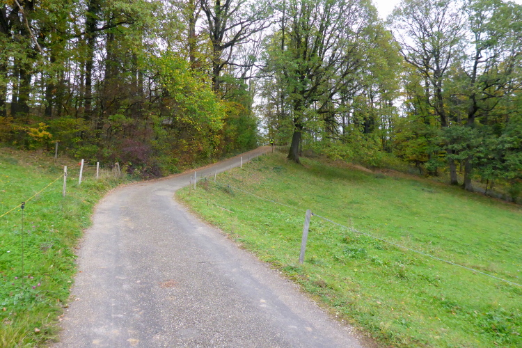 Der erste richtige Anstieg kommt in Sicht. Vom asphaltierten Weg biegen wir in einen Waldweg ein. Hier muss ich Laura ziehen lassen. Mit langen Schritten steigt sie mühelos voran (km 10). Der Wald öffnet sich und das majestätische Schloss Wäscherburg (kurz auch Wäscherschloss genannt) thront über einer grünen Weide. Edle Pferde grasen zu seinen Füßen. Das herbstlich gefärbte Laub der Obstbäume unterstützt noch das Postkartenmotiv.