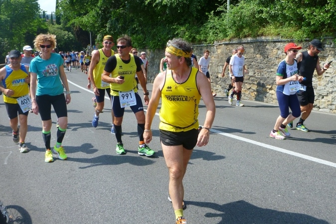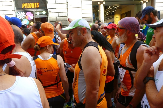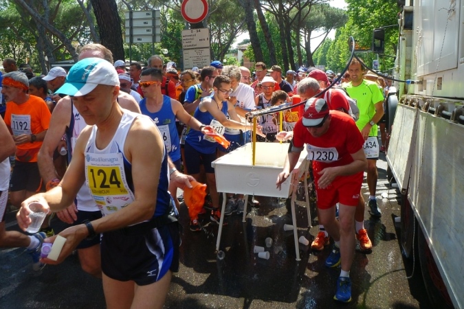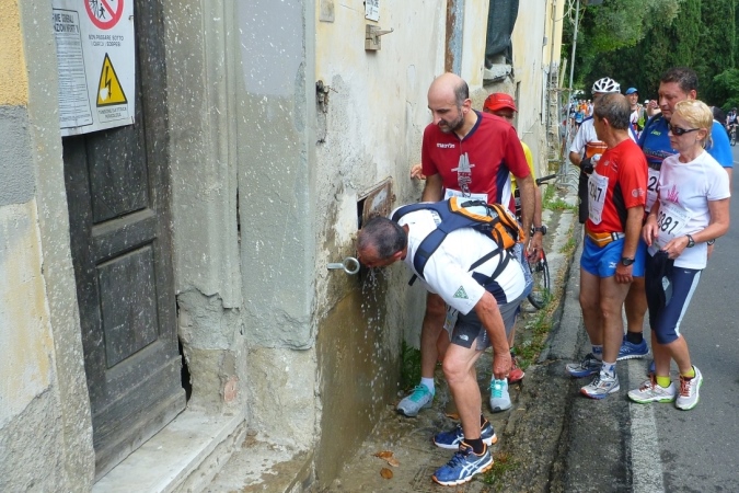 Laut Höhendiagramm geht es erst nach der ersten Verpflegungsstelle (VS) an der Piazza Edison bei Km 4 aufwärts. Aber schon vorher steigt die Straße leicht an. An der VS, italienisch Ristoro, lasse ich ob des Gedränges die Getränke unbeachtet, ich bin ja Selbstversorger mit Trinkrucksack. Aber meine Kappe tauche ich in Wasser ein. Kühlung ist angesichts der Hitze unbedingt notwendig.