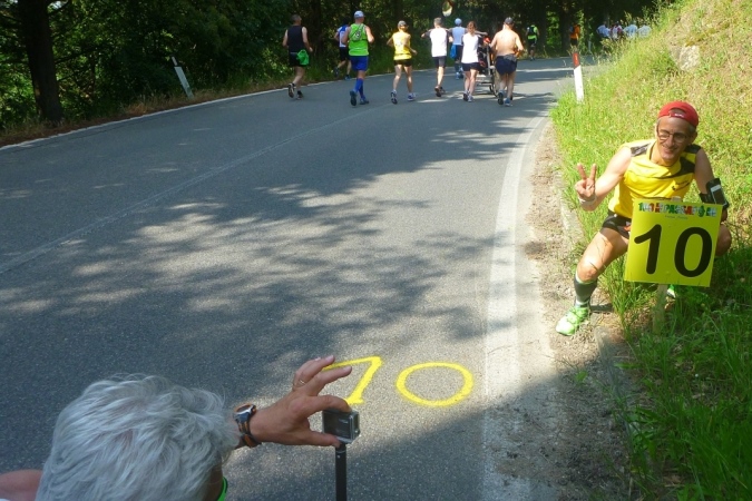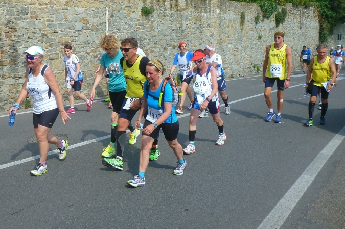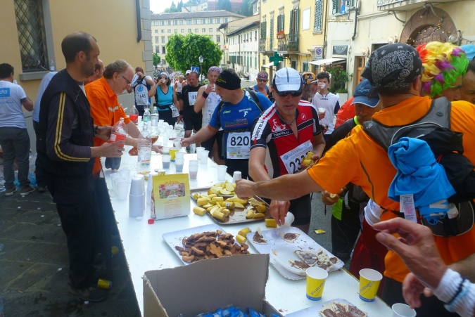 Im Ort ist die zweite VS. Klasse, was uns an den Ristoros so alles geboten wird. Keiner braucht hier zu hungern oder zu dursten. Etwa alle 5 Km sind Ristoros und bieten alles, was der Läufer begehrt. Ich greife gerne zu. Bei solch einem langen Lauf braucht man Nachschub.