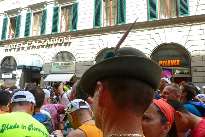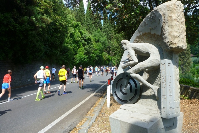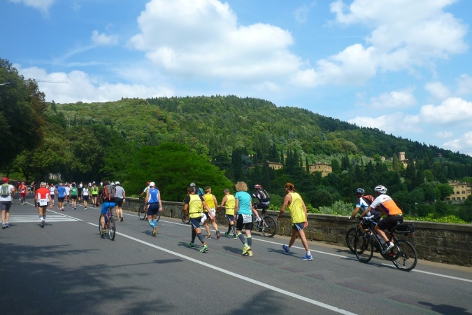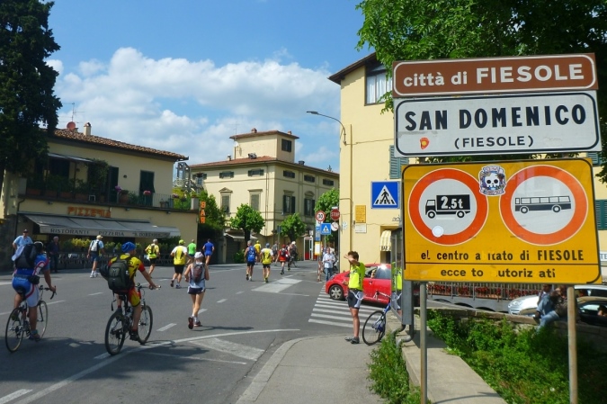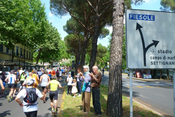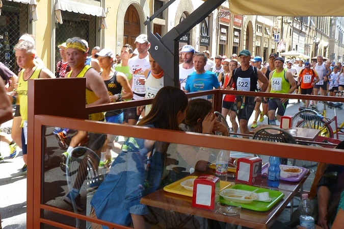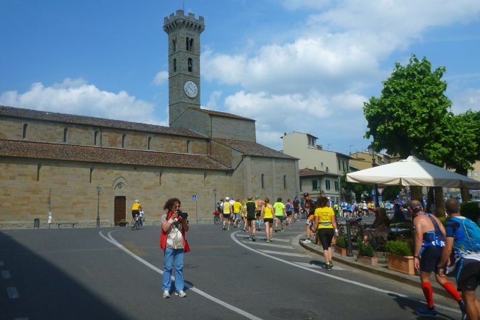 Ein Läufer mit einer Fahne fällt mir auf. In Fiesole werde ich ihn noch einmal sehen. Am Rande sitzen Touristen in den Cafes und Restaurants und essen Eis und Kuchen, trinken Kaffee und feuern uns an. Vorbei geht es an schönen Plätzen, Kirchen und Palazzi. Das Feld ist noch dicht beisammen.