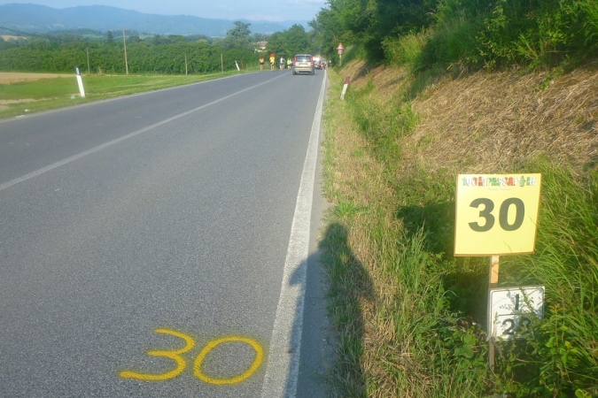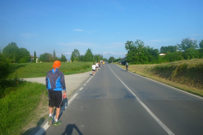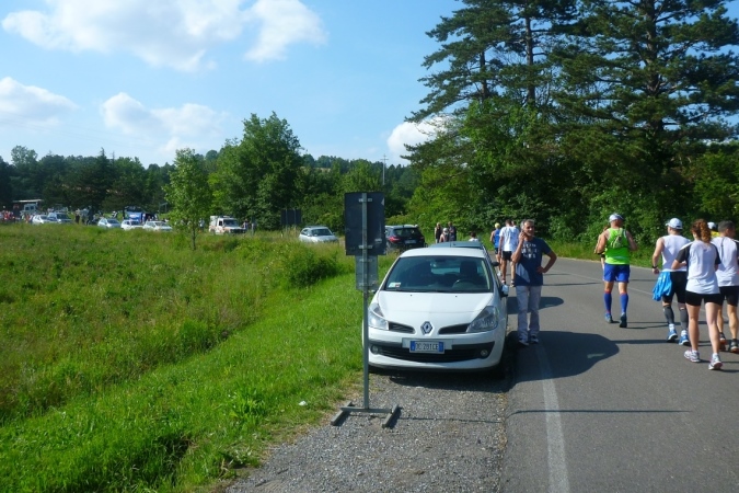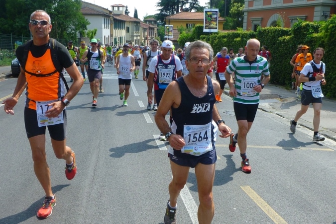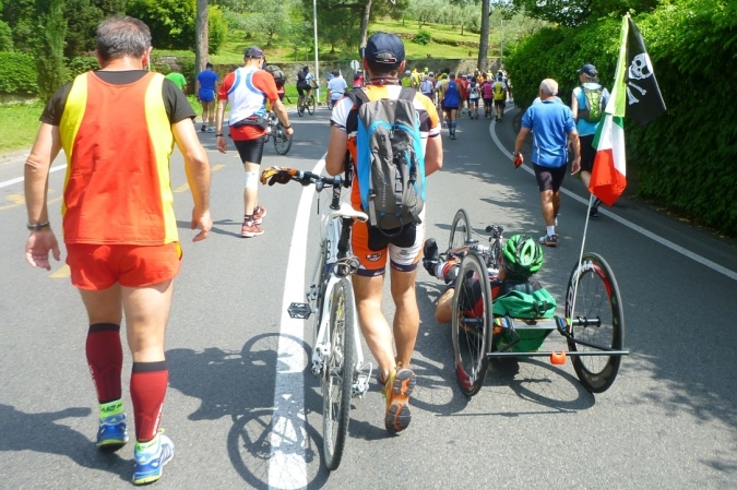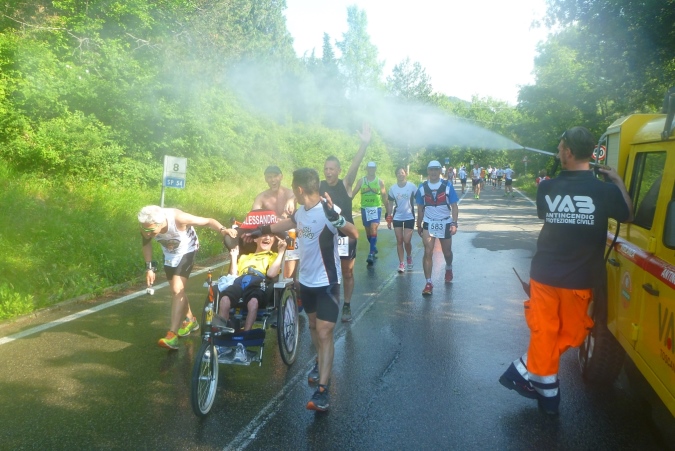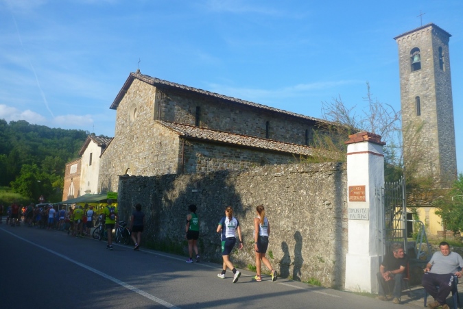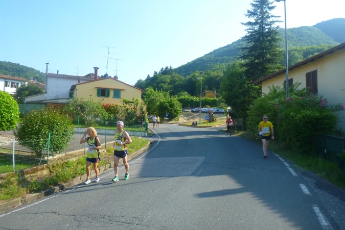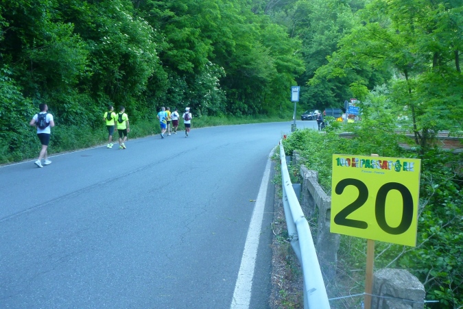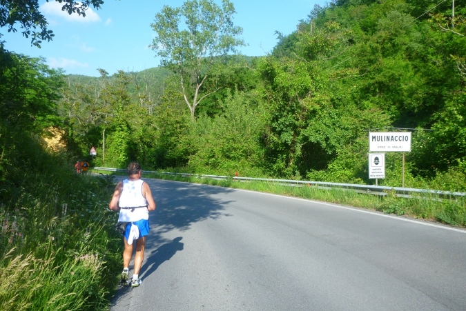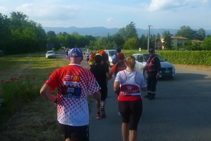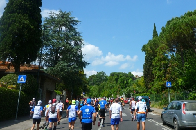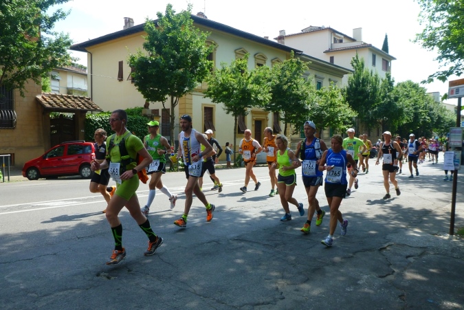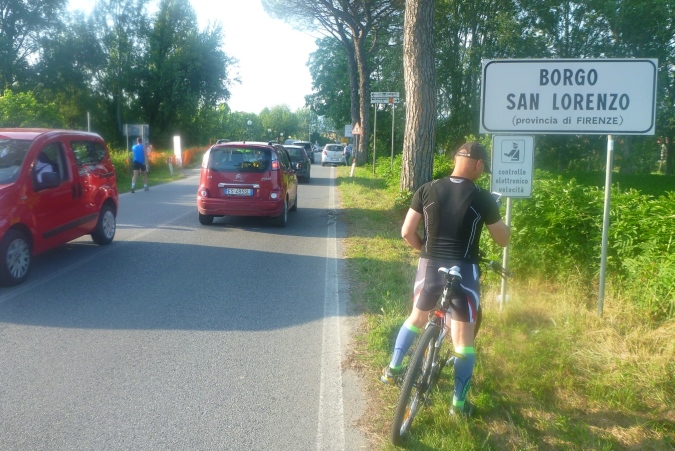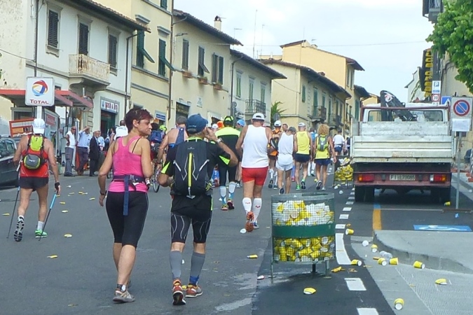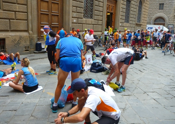 Der Start ist um 15 Uhr. Den Kleiderbeutel fürs Ziel in Faenza gebe ich bei LKW Nr. 1 in der Nähe ab. Die LKW's 2 und 3 transportieren Wechselkleidung nach Borgo San Lorenzo (Km 31,5) bzw. zum Passo della Colla (Km 48). Ich bleibe autark und führe wieder im Trinkrucksack eine leichte Windjacke für die Nacht mit. Das reicht. Unterwegs wird nix gewechselt.