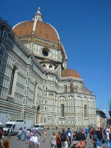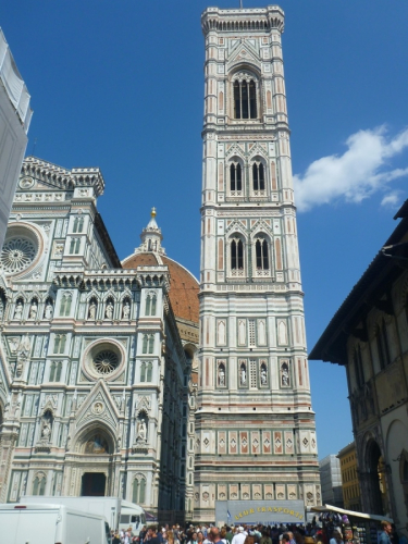 Nach wenigen Metern ist der Dom und der unmittelbar neben ihm stehende Campanile erreicht. Vorgestern hatte ich beide bestiegen und so ein letztes Höhentraining. Ob das wirklich gut war? Ich fühle mich absolut schlapp. Die schwüle Hitze macht mir mächtig zu schaffen.