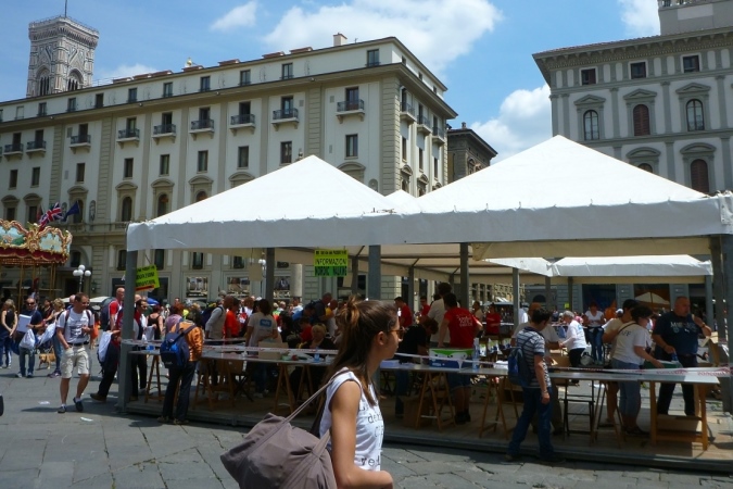 Uns erwartet in Fiesole neben einer guten Stimmung an der Piazza Mino da Fiesole viel Mittalter und sonstiges geschichtsträchtiges. Prächtig liegt er da vor uns, der romanische Dom Santo Romolo, 1208 begonnen mit seinem 43 m hohen Glockenturm. An der Piazza sind die Cafes gut besucht. Wir erfahren viel Zuspruch.
