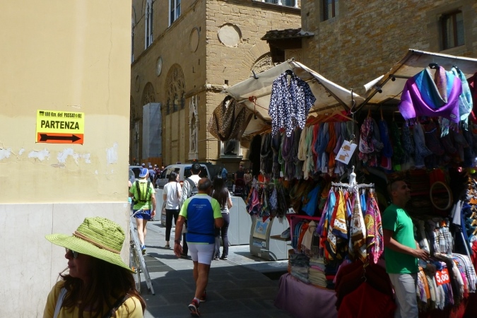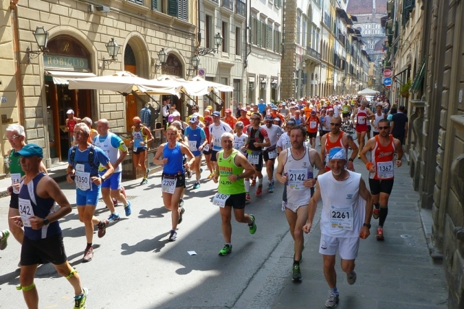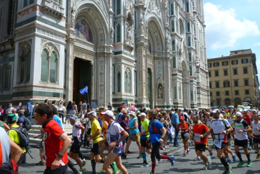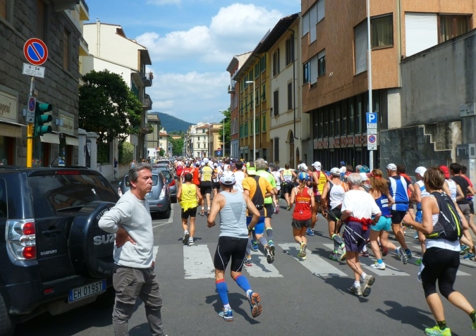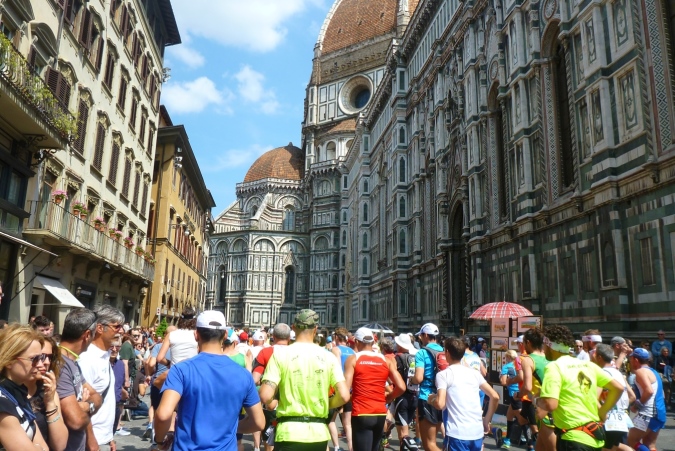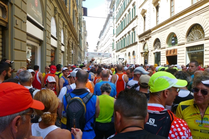 Der Start erfolgt beim Dom in der Via Calzaiuoli. Die schmale Straße ist dicht bevölkert mit Läufern. In den Eingängen der Geschäfte links und rechts stehen Verkäufer und Zuschauer. Die Athmosphäre hat schon was.