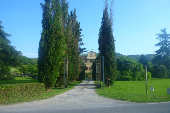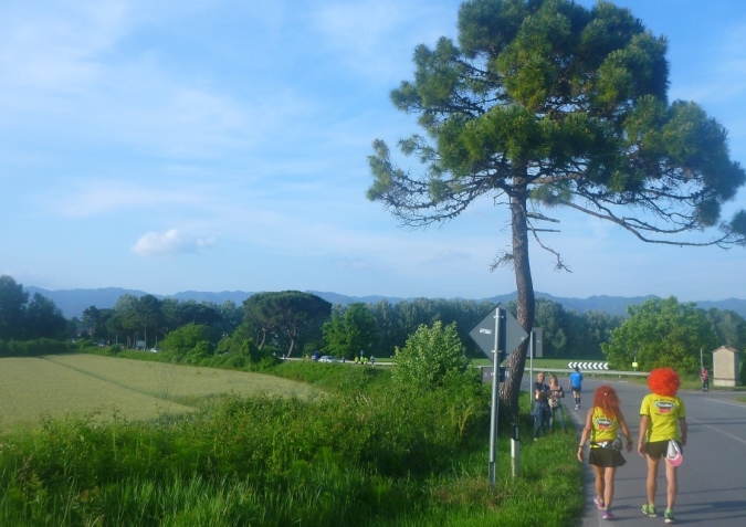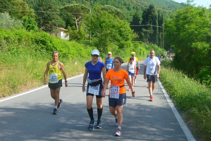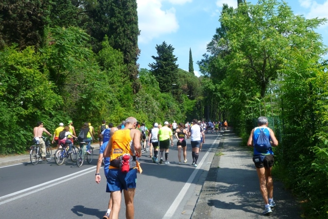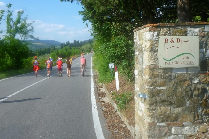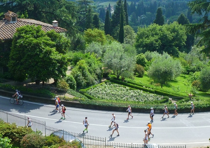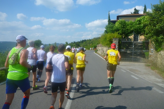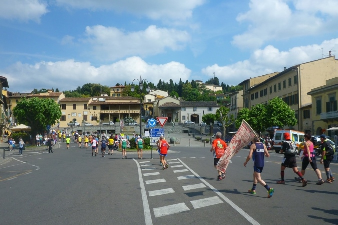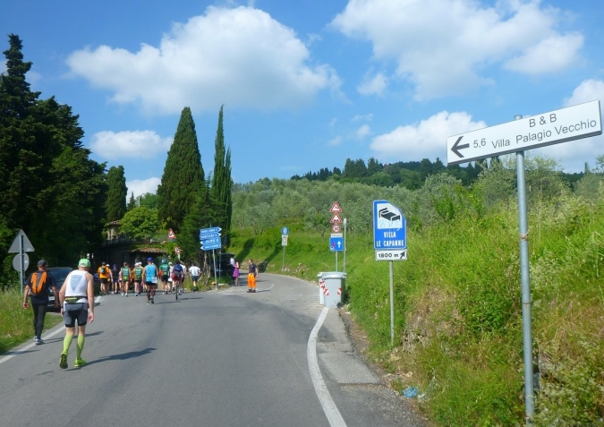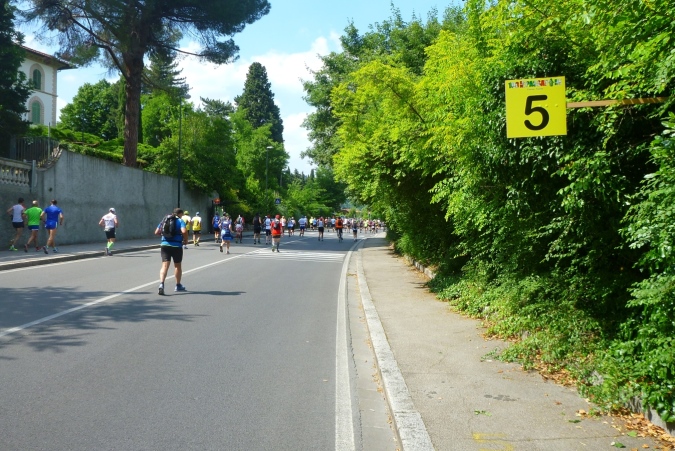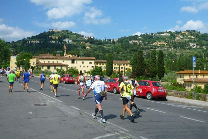 Tempomäßig halte ich mich zurück. Ich will hier keine bestimmte Zeit laufen, nur in Würde ankommen. Das zweite gelbe Km-Schild wird oberhalb von Fiesole passiert. Ein Zehntel ist rum, denke ich und trabe weiter durch die herrliche Hügellandschaft der Toskana. Die Landschaft ist beeindruckend. Ein Kuckuck grüßt. Wenn nur die Hitze nicht wäre.