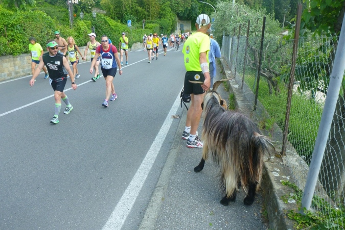Ein Läufer mit einem Foto auf seinem Shirt und bunter Kopfbedeckung fällt mir auf. Es ist der Onkel des kleinen Addo, steht so auf dem Shirt mit dem Foto des Säuglings. Und was sehe und rieche ich am Rande der Strecke kurz vor Fiesole? Einen prächtigen Ziegenbock.