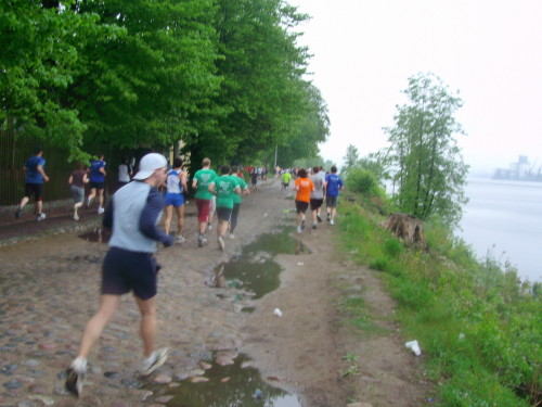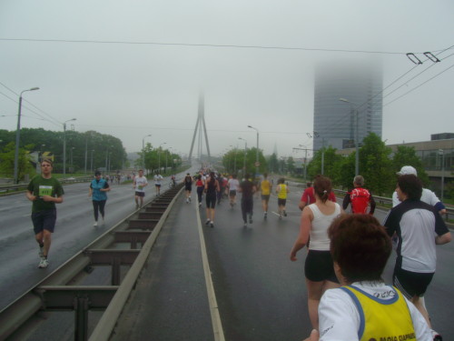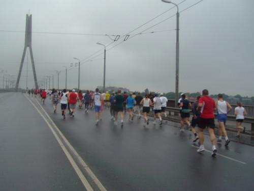 Der Kurs hat 14 km und ist von den Marathonis dreimal zu laufen. Zuerst ging es in Richtung Vandsu Tilts, einer 800 Meter langen Brücke über die Düna (lettisch: Daugava), ein in die Ostsee mündender 1.020 km langer Fluss. Seine Quelle hat er in Russland in den Waldaihöhen, wo in der Nähe auch die Wolga ihren Ursprung hat.