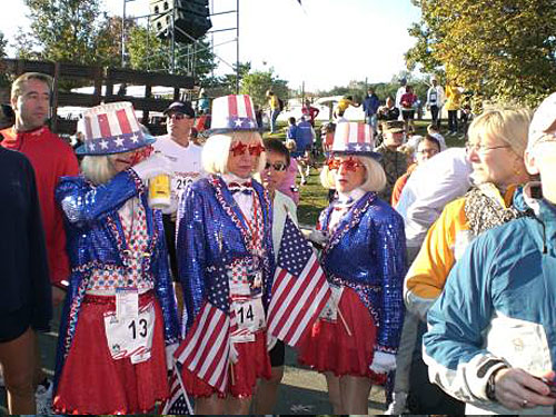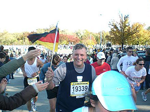Über den Washington Boulevard und den Jefferson Davis Highway, vorbei am Arlington National Cemetery, ist es kaum noch ein Kilometer. Die letzte Wasserstelle lasse ich aus, es kommt eh nichts mehr an. Dreihundert Meter vor dem Ziel mache ich das, worauf ich mich schon seit Monaten freue: ich ziehe meine von der WM übrig gebliebene Deutschlandflagge aus der Hose (nein, sie ist sauber und unbefleckt, dafür hat man ein Plastiktütchen) und laufe auf der letzten giftigen Steigung mit fliegender Fahne ein. So etwas kommt auch bei den Amerikanern prima an.