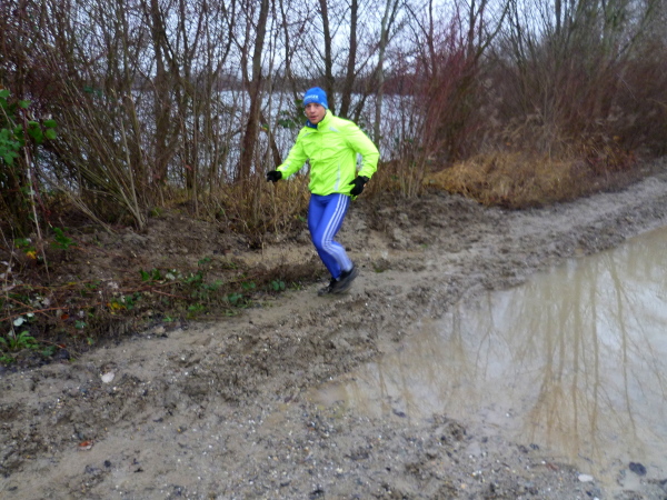 Am besten zu laufen ist noch die Straße am Anfang jeder Runde und der Trail zum Ende hin. Aber auch der Trail ist an den ganz engen Stellen matschig geworden. Ich versuche hier, durch erhöhtes Tempo die Rutschgefahr zu minimieren. Der See ist an dieser Stelle auch nur noch einen halben Meter weg, was das Ganze noch spannender macht.