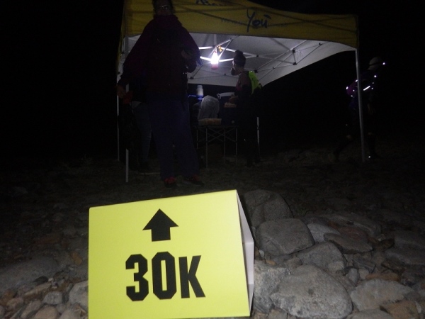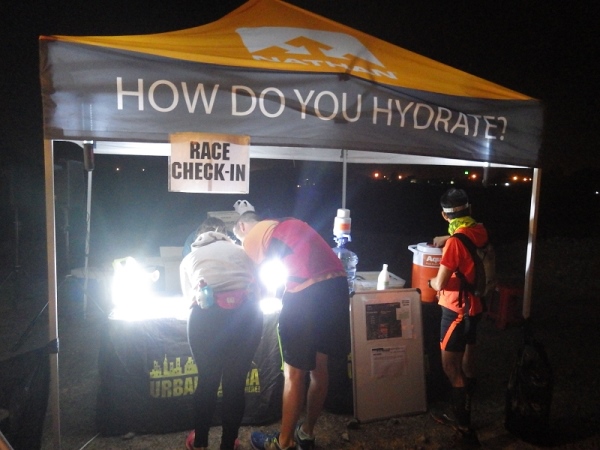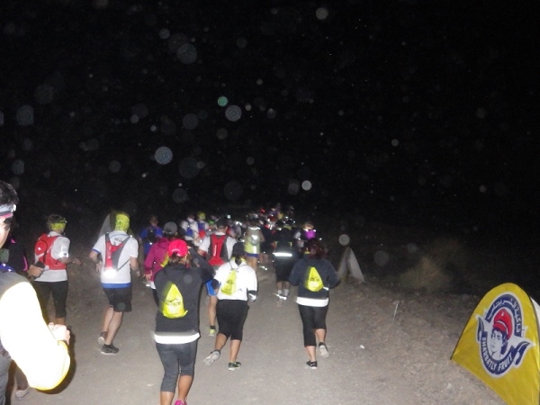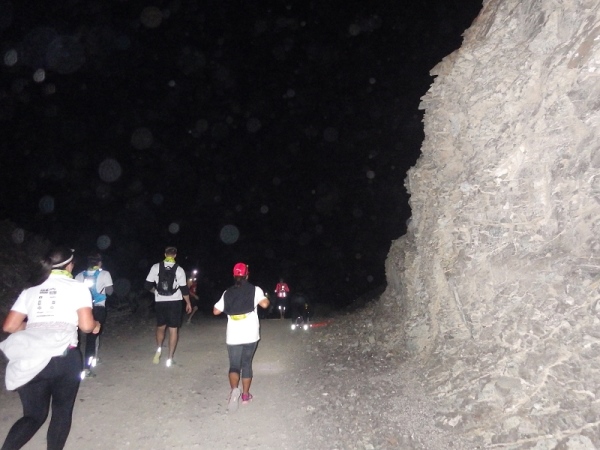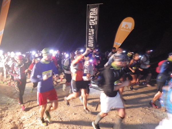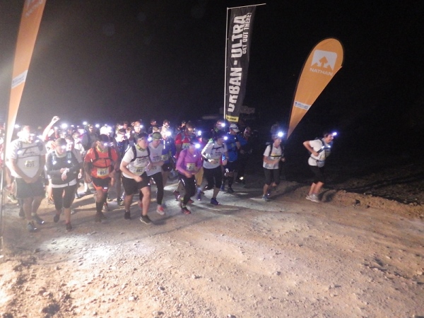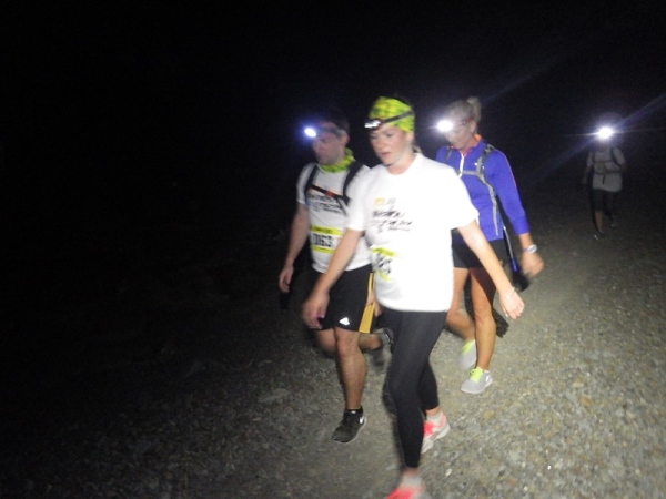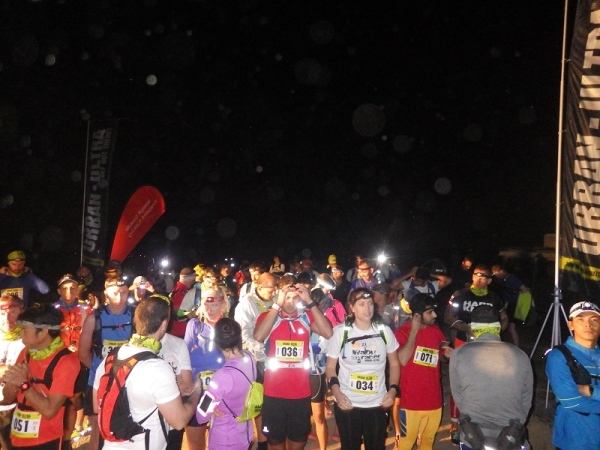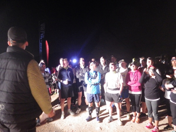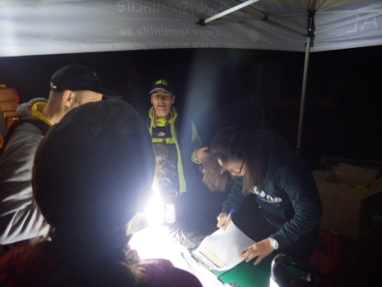 Es waren offenbar recht viele „Wiederholungstäter“ dabei und darunter auch etliche mit schlechten Erfahrungen bezüglich der Streckenmarkierungen. Deshalb wies die Race Directorin auf die etwas kritischen Stellen hin und meinte, die Strecke wäre diesmal noch besser mit und reflektierenden Bändchen ausgezeichnet. Dann wurden die Vollzähligkeit der vorgeschriebenen Ausrüstungsgegenstände überprüft, Dazu gehörten 1,5 Liter Flüssigkeit, Stirnlampe, faltbarer Trinkbecher, Erste Hilfe Päckchen und Handy mit Notfallnummer.