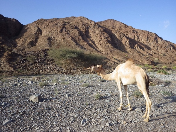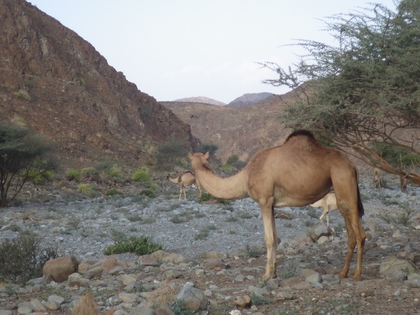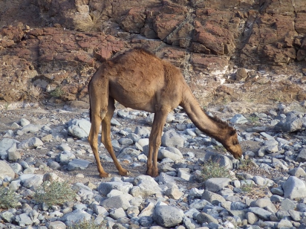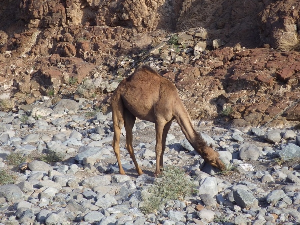 Plötzlich tauchten vor mir Kamele auf. Waren die nachts auch schon da? Ich hatte nur Kameldung gesehen. Aber jetzt sind sie da, die „Wüstenschiffe“. Die bis zu 700 kg schweren Tiere nehmen in kurzer Zeit sehr viel Wasser auf, das sie in ihrem Höcker speichern. Die Ur-Camelbags sozusagen. Kamele sind sehr genügsam und auch recht freundlich. Ich konnte locker zwischen ihnen durchlaufen und die Zeit reichte auch noch für ein kleines Fotoshooting. Ein kurzes Stück weiter waren dann auch noch 2 ganz junge Kamele zu sehen, noch nicht ganz 3 Monate alt. Ich hielt an, um mich an dem Anblick dieser einmaligen Tiere zu erfreuen. Man hat schließlich nicht oft die Gelegenheit diese in freier Natur zu erleben.