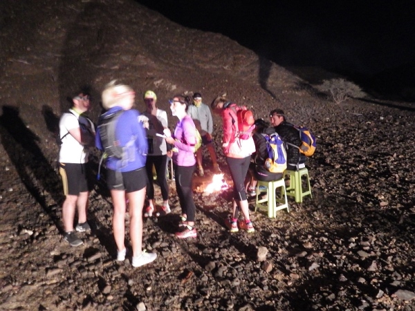 Da muss es doch auch noch etwas anderes geben. Und siehe da, ich werde fündig. Der Wadi Showka Trailrun ist zwar kein Marathon, dafür werden 5 km, 10 km, 20 km und 30 km angeboten. Ich hatte mich für die 30 km entschieden. Start ist um 5 Uhr morgens, wegen der normalerweise doch sehr hohen Temperaturen. Das Wadi Showka liegt etwa 100 km außerhalb von Dubai mitten in der Wüste und ist etwas schwer zu finden. Aber am Ende gelang es mir dann doch und ich war rechtzeitig zum Briefing da. Etwa 160 Läufer und Läuferinnen hatten sich bei 6 Grad am Start eingefunden und versammelten sich bevorzugt am Lagerfeuer.