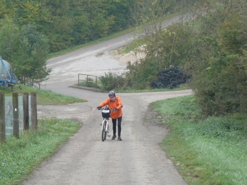 Ein Verfolger kann aufschließen, das ist mein Friseur, der Herbert, der mit GPS und Fahrrad unterwegs ist. Der bleibt dann an der folgenden Steigung zurück. Er schiebt. Ja, die rund 700 Höhenmeter wollen auch bezwungen werden, und gut 100 warten nun auf dem folgenden Teil bis zum höchsten Punkt des Kurses. Da sollten wir einen schönen Blick auf die Monheimer Alb und nach Süden haben. Doch je weiter wir nach oben kommen, desto nebliger wird es. Mitunter beträgt die Sicht nur 100 Meter. Schade.