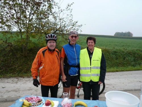 Die erste Verpflegungsstation ist bei Graisbach (Beginn der 32 Kilometer-Strecke) kurz nach einem Reiterhof eingerichtet. Ich bin überrascht, dass schon 13 Kilometer hinter uns liegen. Die Helfer ziehen sich gerade die Warnwesten an und rühren den warmen Tee an. Ich sehe auch noch Wasserbecher, Bananen, Äpfel und selbstgebackenen Kuchen daliegen. Was will man da als Teilnehmer mehr?