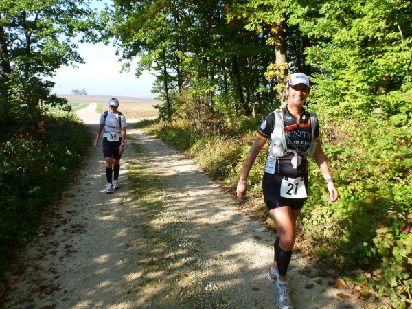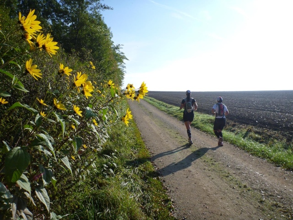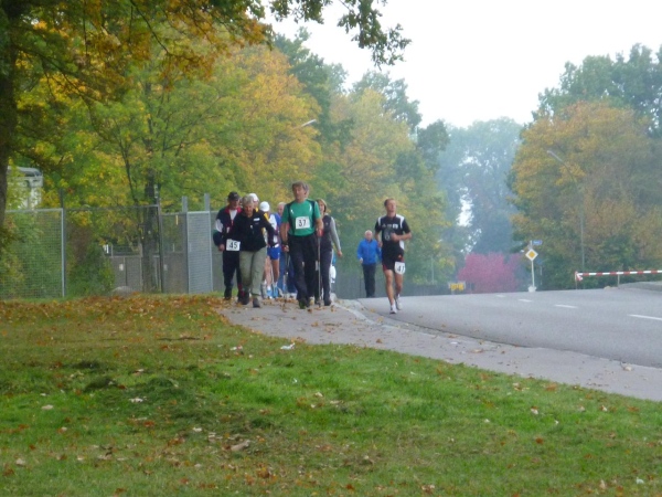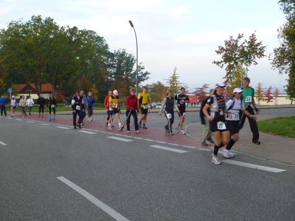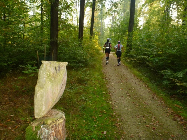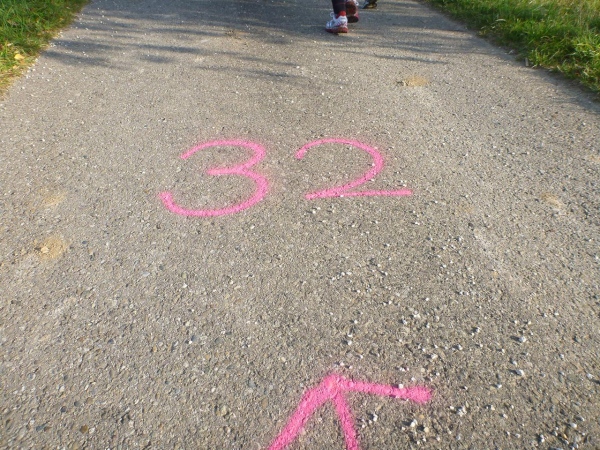 Vom Freibad führt jetzt die Strecke nach Norden, zuerst auf der Straße, dann verlassen wir die Asphaltpiste. Vereinzelte Wohngebiete und Waldwege wechseln sich ab. Ich bin nicht allein, sondern zwei Frauen, ausgerüstet mit Trinkrucksack und modischer Trailausrüstung sind auf meiner Höhe. In kurzer Zeit ist ein Abstand zu den Walkern herausgelaufen. Ein Radfahrer von einem unterstützenden Verein weist uns den Weg.