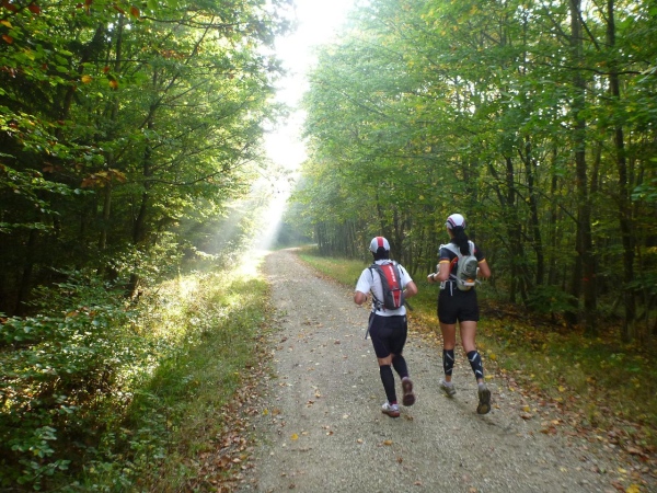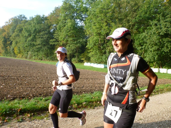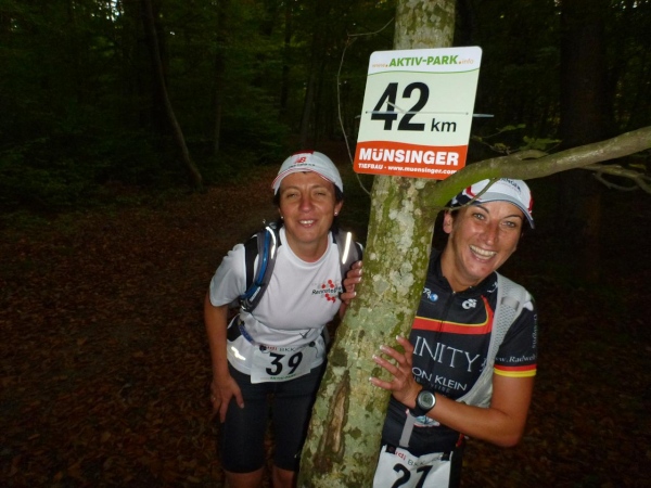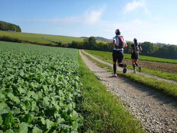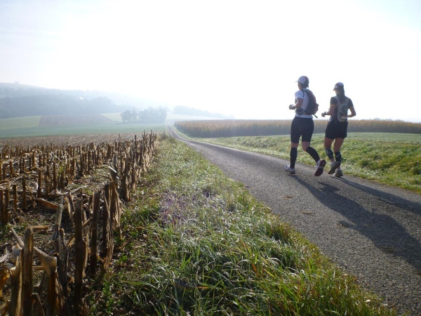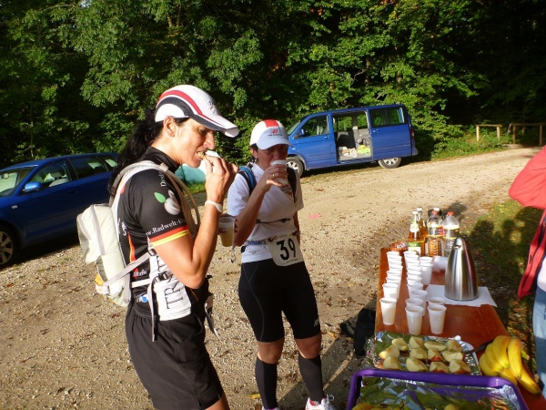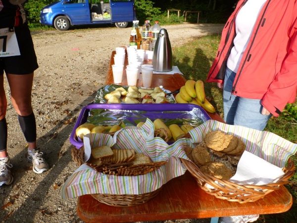 Die nächste Verpflegungsstation liegt bei Graisbach (Beginn der 32 Kilometer-Strecke). Bei einem Reiterhof können wir wieder verpflegen. Und die Helfer in ihren neongelben Jacken habe ich kurz vorher schon bei der Ausschau nach den ersten Läufern gesehen. 13 Kilometer sind wir schon gelaufen. Zitronentee, Wasser, Obst, Traubenzucker und Calzium- und Magnesiumsticks gibt es zu schnabulieren.  Was will man da als Teilnehmer mehr?