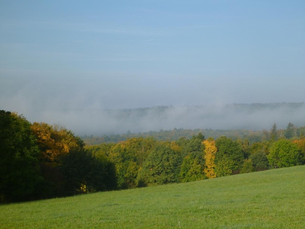 Nach ein, zwei Bechern Getränke machen wir uns auf die weitere Reise. Rechterhand ist die Ortschaft Hafenreut zu sehen. Die Aussicht ist grandios, denn hinter uns lösen sich die letzten Nebelschwaden auf.