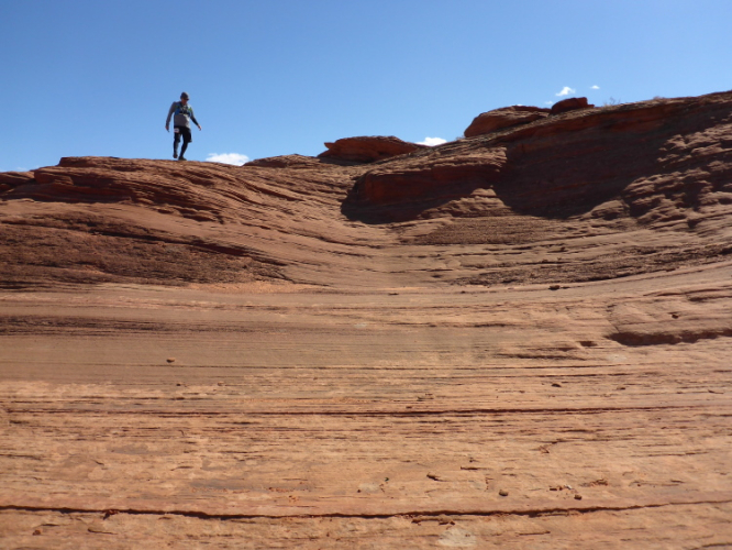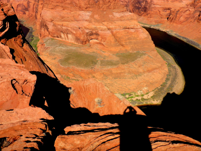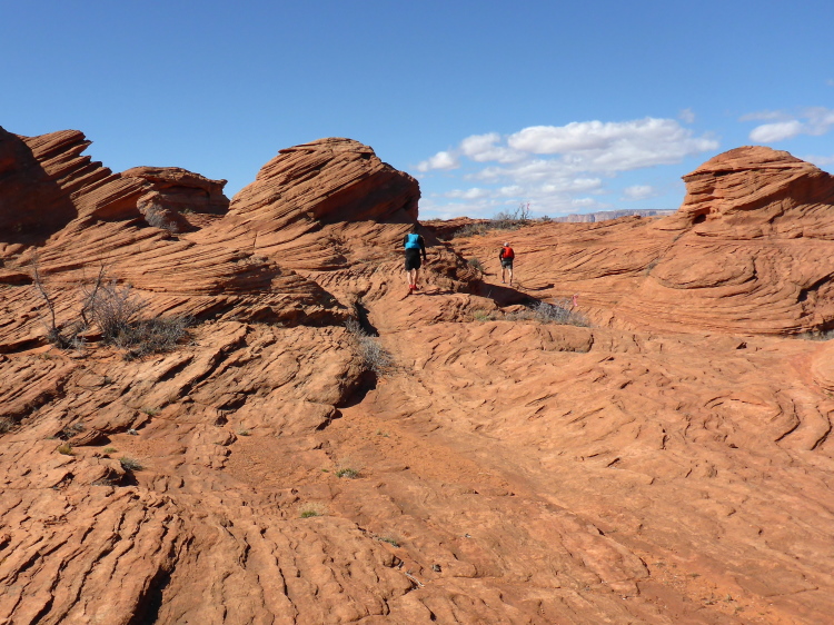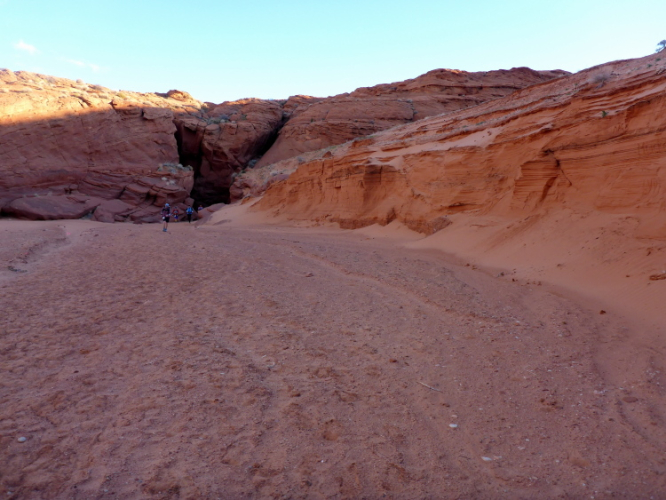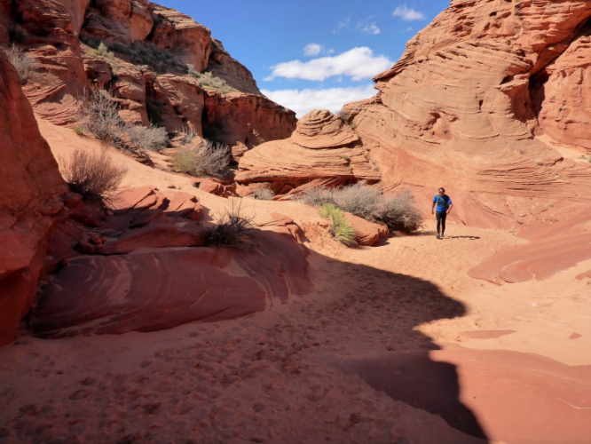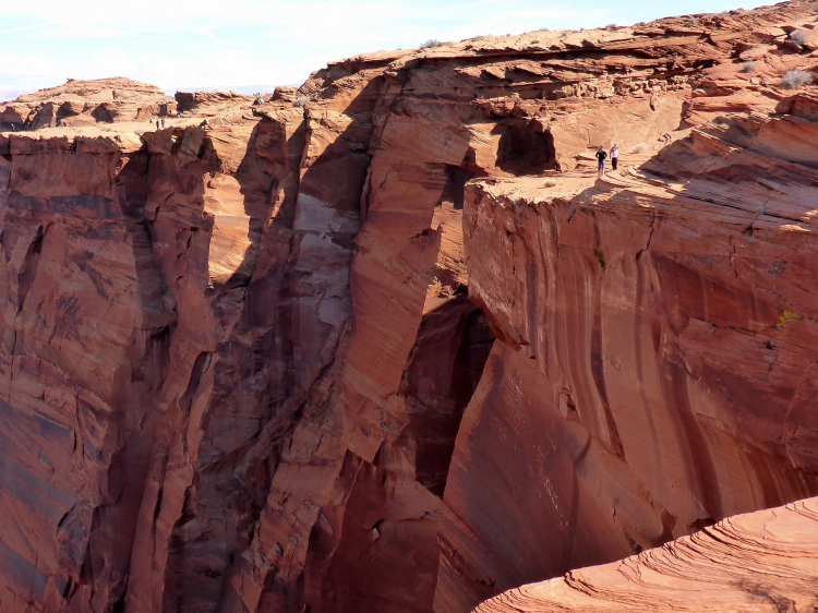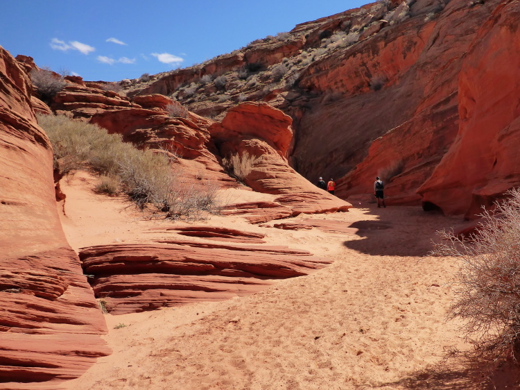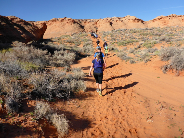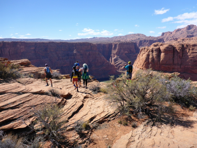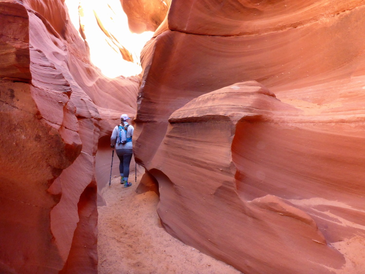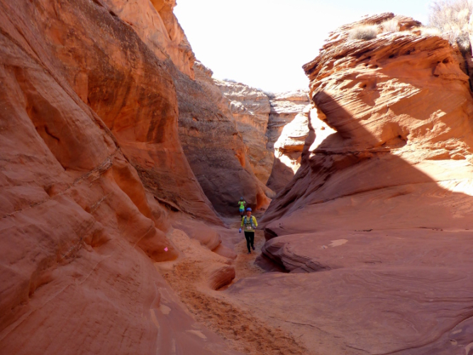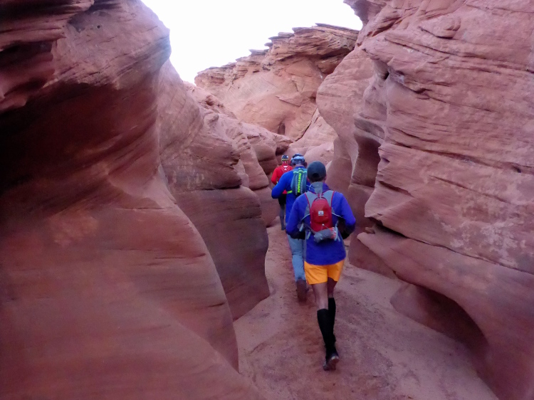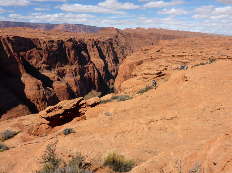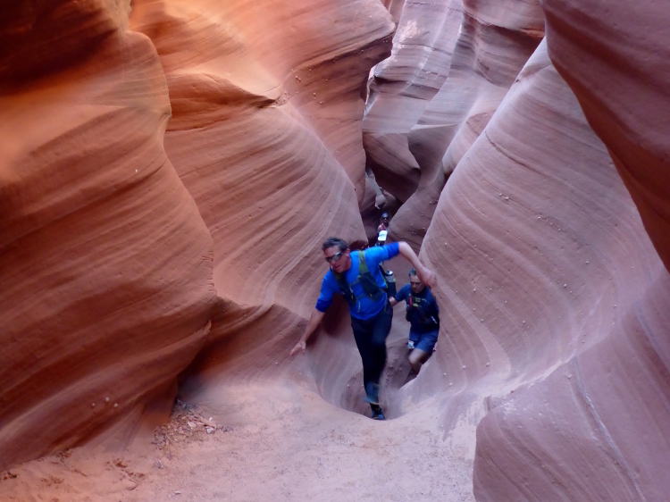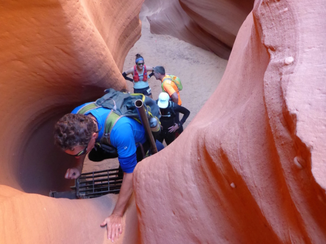 Wir begleiten den Colarado River am Rand entlang. Hier gibt es keine Absturzsicherung. Du kannst gehen bis an den äußersten Rand. Die Strecke ist einfach der Hammer. Aber auch anstrengend. In stetigem Auf und Ab geht es bis zu einer weiteren Schleife, an der wir den Fluss in Richtung Waterhole Canyon verlassen. Durch tiefen Sand erreichen wir den VP am Eingang zum Canyon. In einer wilden Kraxelei geht es bis zum Grund und wir verschwinden in einer schmalen Felsspalte. Mal über Leitern, mal mit Klettereinlagen durchqueren wir den Flusslauf, der bei Regenereignissen, wie die anderen Slot-Canyons gesperrt ist.
